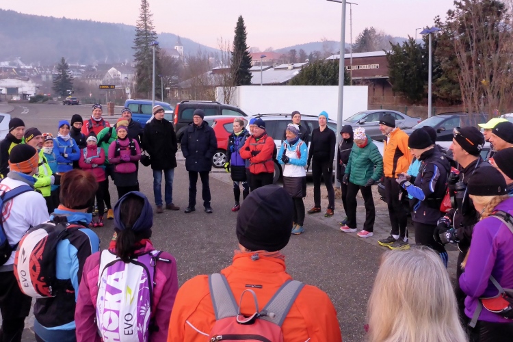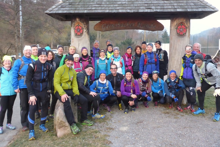 Um acht Uhr begrüßen uns am Parkplatz vor dem Bahnhof Gernsbach Andreas, Brigitte und R(ud)olf sowie der Gernsbacher Bürgermeister Knittel, der aber nicht mit läuft. Teilnehmen kann jeder. Der Start ist kostenlos, Voranmeldung und anschließend eine Spende sind zwar erwünscht aber nicht Bedingung. Das Tempo bei diesem Gruppenlauf richtet sich nach den langsamsten Teilnehmern. Etwa die Hälfte der Anwesenden kennen sich von vielen Laufendhelfen.de Veranstaltungen, dazu kommen einige Ultratrail-Läufer aus anderen Regionen Deutschlands. Alles wirkt wie ein großes Familientreffen. Und falls jemand hier tatsächlich niemanden kennen sollte - in dieser Gruppe findet jeder schnell nette Kontakte.