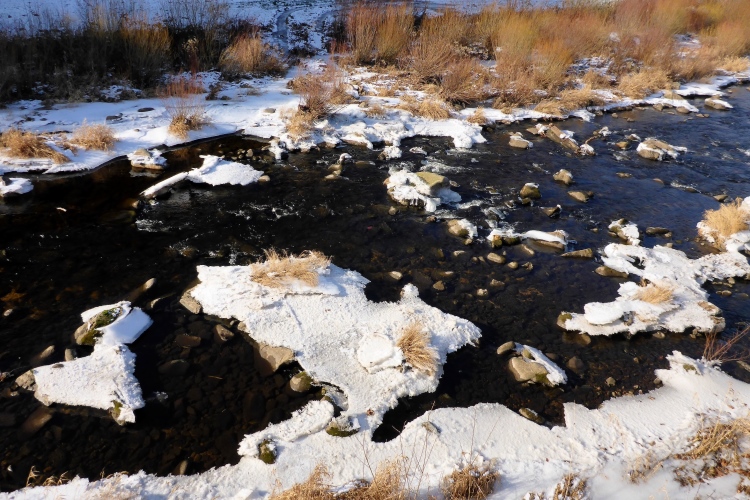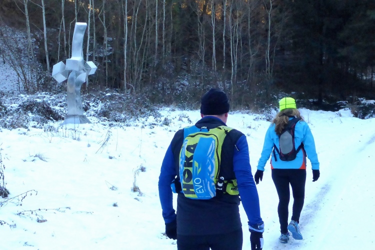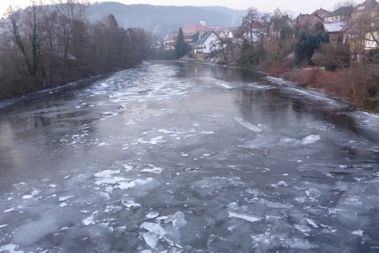 Gleich nach dem Start überqueren wir die Murg, auf der heute große Eisschollen liegen. Wir laufen die in beiden Richtungen gut markierte Runde wie gewohnt gegen den Uhrzeigersinn, beginnen also mit dem Aufstieg zum Merkur.