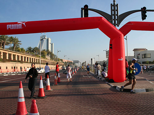Auf den ersten beiden Kilometern waren noch ein paar Kurven, dann wurden die geraden Abschnitte immer länger, bis es nach knapp sechs Kilometern auf die Jumeira – oder Beach-Road ging. Ab hier ging es die nächsten rund 14 km fast geradeaus bis auf Höhe des berühmten Hotels Burj al Arab, wo sich bei km 20 ein Wendepunkt befand.