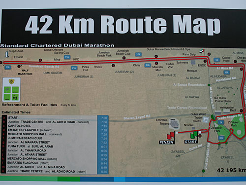 Flach und schnell an einigen der Sehenswürdigkeiten Dubais entlang geführt. Bis auf gepflasterte Fussgängerüberwege auf der Jumeira Road hervorragend asphaltiert. Es gibt nur zwei minimale Anstiege zwischen Kilometer 39 und 40. Allerdings ist sie für den Genussläufer, der die Abwechslung mag, nicht so interessant oder wie der AIMS-Streckenvermesser Paul Hodgson sagte: „Joe Jogger might not love it“.