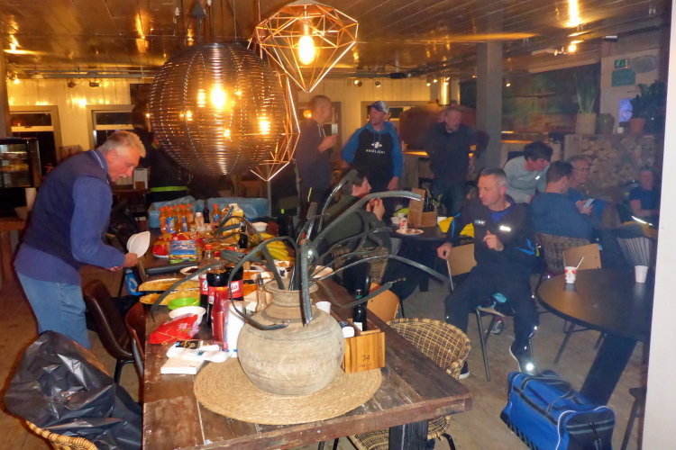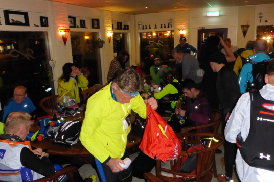 Kaum stehe ich am Tisch mit der Startnummernausgabe, da kommen schon die ersten 135- und 105 Kilometerläufer herein. Die sind heute Mittag in Deining aan zee, also „Dünen an der See“,  „tweede paviljoen rechts in der Stadt Castricum aan zee“, also dort sind die gestartet. Und dort wird mein 50er in spätestens nach acht Stunden gefinisht sein. Das Strandrestaurant „Deining“ ist das Zentrum für das Rennen. Zwischen dem Wienerhof und dem Deining gibt es nur eine Wasserstation und die ist  beim Ziel des  25 Kilometer-Laufes. Keine Markierungen. GPS-Daten sind „normaal gesproken“ nicht notwendig, es geht einfach am Strand entlang. Nur wer 75 Kilometer und mehr laufen will, braucht Navigation, denn dann geht es östlich durch die Grasdünen.