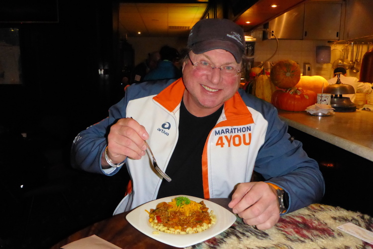 Die angetretenen Läufer sind notiert. Bei Kilometer 25 und 50 wird die Ankunft kontrolliert, es soll niemand am FKK-Strand zurück bleiben. Im Wienerhof gibt es Snacks und warme Getränke. Die Pasta kostet 5 Euro, ist sehr gut. Im Nebensaal wird ein Bridgeturnier ausgetragen. Ist das Sport? Ich habe mich für die 50 Kilometer gemeldet (17,50 Euro) und hatte Glück, über die Warteliste rein zu rutschen.  Und jetzt?
