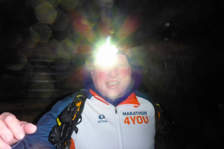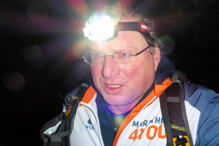 Nur gut, dass meine Uhr die Kilometer zählt. Etwa bei km 13 überhole ich Dave, seine Stirnlampe gibt auf. Wir versuchen uns im Sturm zu unterhalten. Er spricht Indonesisch, ich Französisch. Da läuft was in unseren Hirnen nicht korrekt.  Aber ich verstehe ihn, er ist in Batavia geboren worden und will bei km 25 raus. Und dann passiert etwas Seltsames: Wir bleiben für ein gemeinsames Selfie stehen, da sacke ich kraftlos in mir zusammen, und er fällt mit einem lauten „OOOOH“ auf mich drauf. Eine verwirrende, peinliche Situation, die man normalerweise erst nach zwei Flaschen Whiskey in einem homoerotischen Etablissement erlebt. Hat mir mal jemand gesagt, der jemanden kennt.