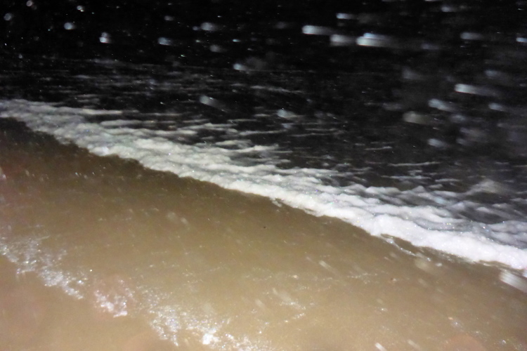 Die hohe Deichtreppe ist schnell genommen. Oben auf der Kuppe schlägt mir der nasse Wind mit scheußlicher Kraft entgegen. Stirnlampen sind auf dem Deich aufgereiht, doch der Regen klatsch genau auf die Linse meiner Kamera. Der Leuchtturm schickt drohend Lichtblitze über das schäumende Meer, als würde er vor einem Tsunami warnen. Treppe runter zum Wasser. Fünf Kilometer schönster Deichradweg, mit zwei leuchtend weißen Streifen.  Den rechten sollte man nicht übertreten, denn ab da geht es sofort die Rutsche hinab in die strandlose Brandung. Diese Deichanlage ist mächtig, das Meer schäumt vor Wut.