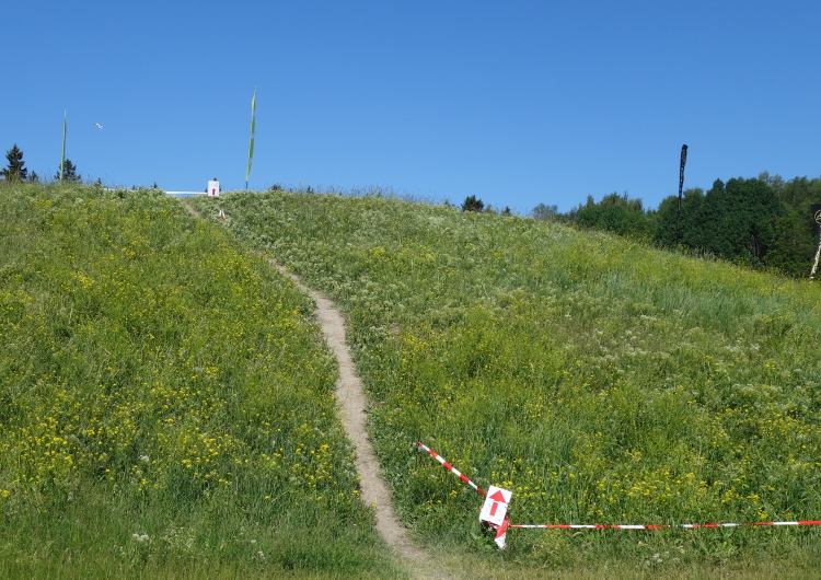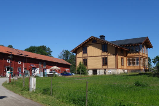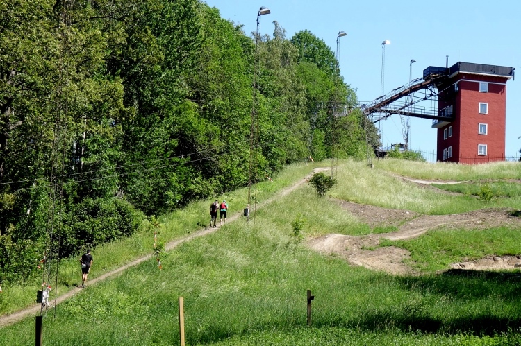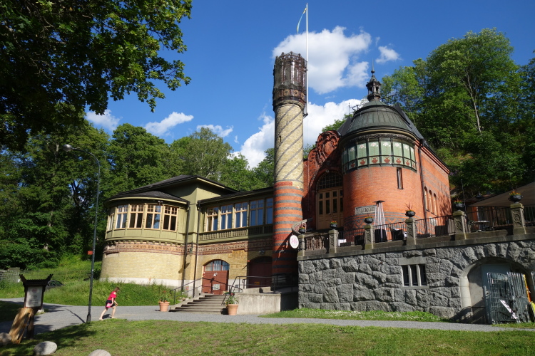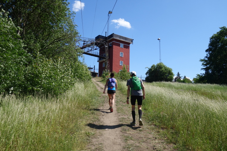 Ich trabe gut gestärkt weiter. Zwei Drittel sind bald geschafft. Wieder müssen einige Meter Asphalt unter die Füße genommen werden. Warum immer in praller Sonne? Wir kommen an einen roten Backsteinturm und erkenne beim Näherkommen die bereits 1904 erbaute Skisprunganlage Fiskartorpets.