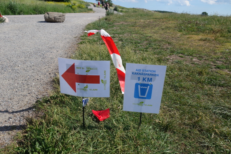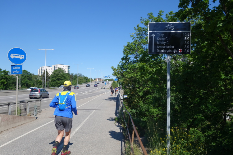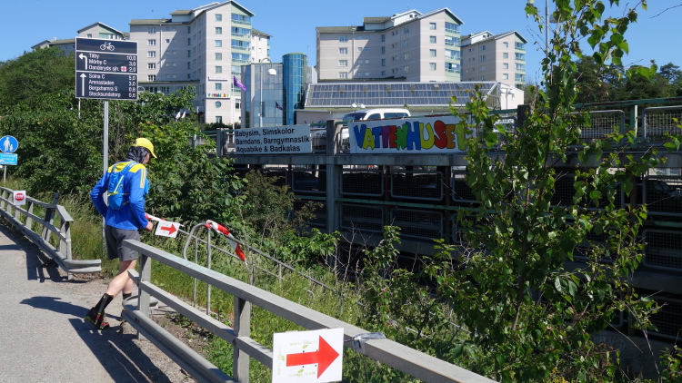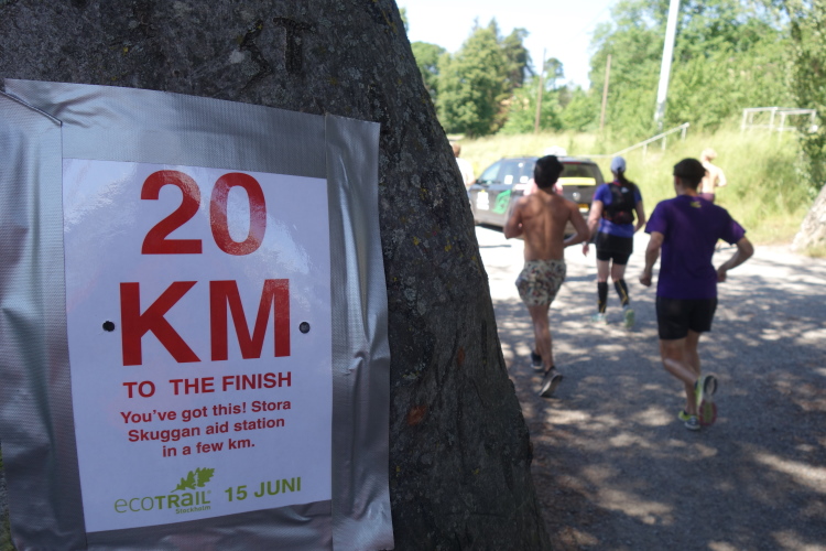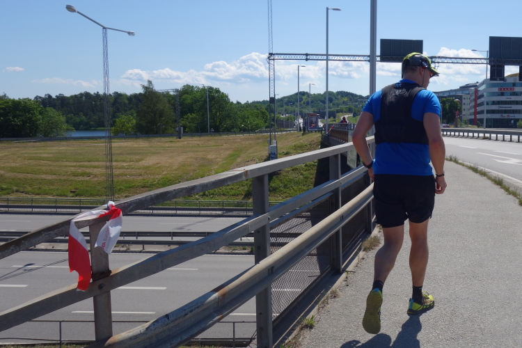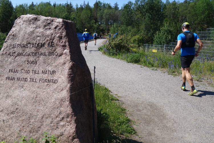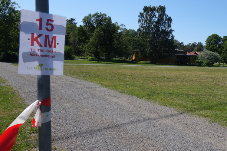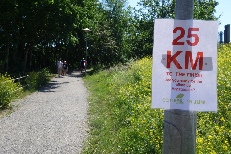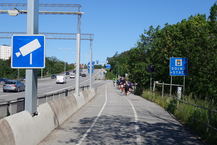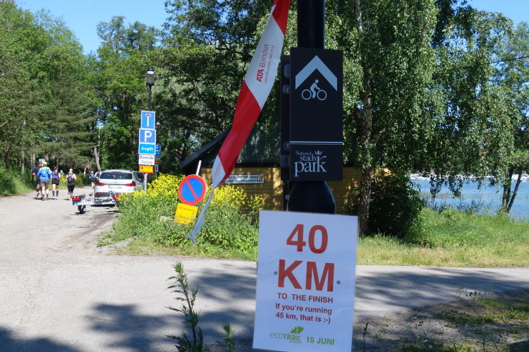 15 Km sind geschafft, ein Drittel ist vorbei und ein Schild weist darauf hin, dass wir nun die Strecke mit den schon um 6 Uhr gestarteten 80ern teilen. Zurück über die zwei Brücken und vorbei beim Igelsbäckers laufen wir weiter durch Wald bis zum Autobahnkreuz E4/E18. Dank der Autobahn und den sichtbaren Gebäudekomplexen werden wir daran erinnert, dass der Trail durch die Metropole Stockholm führt. Man kann es ob der Strecke oft vergessen.