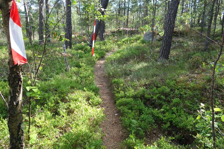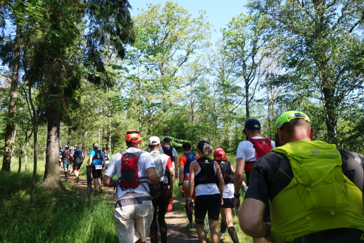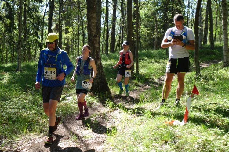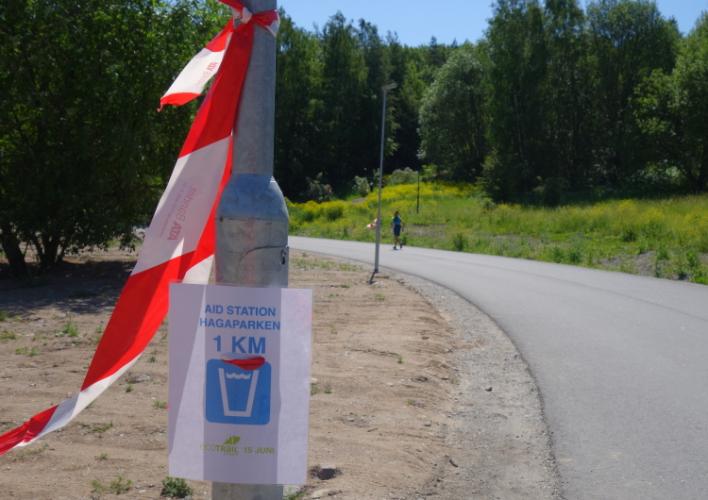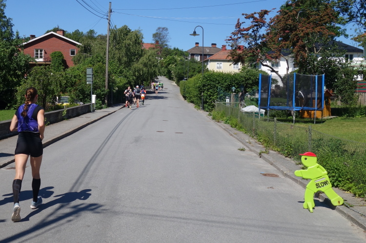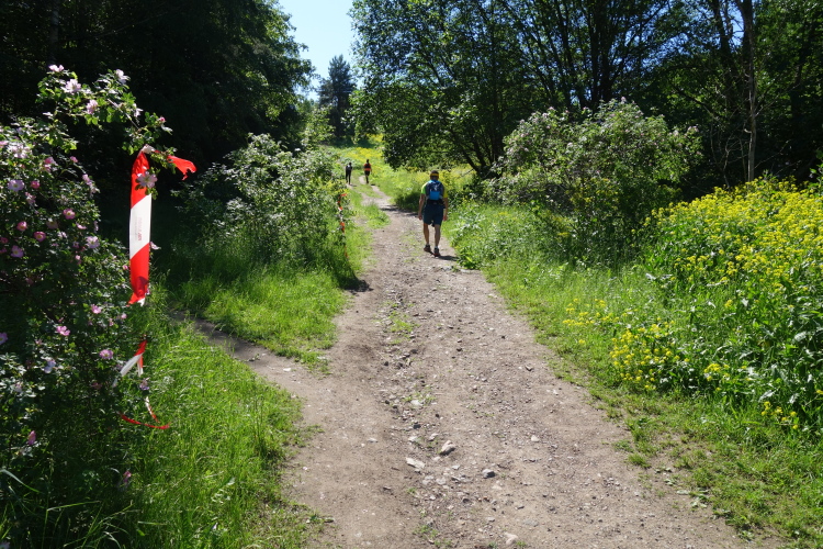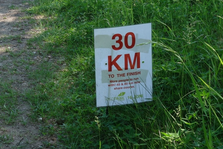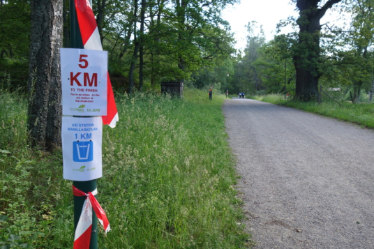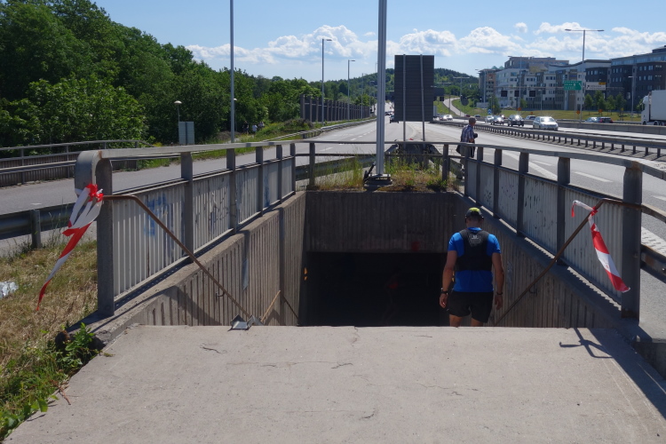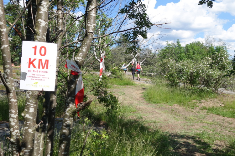 15 Km sind geschafft, ein Drittel ist vorbei und ein Schild weist darauf hin, dass wir nun die Strecke mit den schon um 6 Uhr gestarteten 80ern teilen. Zurück über die zwei Brücken und vorbei beim Igelsbäckers laufen wir weiter durch Wald bis zum Autobahnkreuz E4/E18. Dank der Autobahn und den sichtbaren Gebäudekomplexen werden wir daran erinnert, dass der Trail durch die Metropole Stockholm führt. Man kann es ob der Strecke oft vergessen.