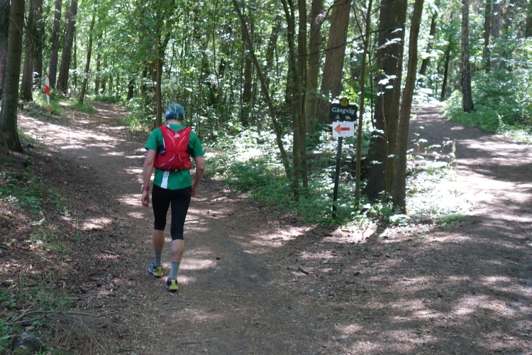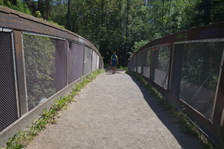 Eine Brücke bringt uns über die Autobahn E 4 zum Natuschutzgebiet Igelbäckens. Ich frage mich, ob man den Namen wörtlich nehmen kann und hier tatsächlich Igel gebacken werden. Die Pumpe vor einem Haus fördert kein Wasser und mein Kopf bleibt hier leider ohne Kühlung. Eine zweite Brücke führt über eine Eisenbahntrasse in ein herrliches Waldgebiet. Km 10 ist geschafft und wir laufen eine etwa 7 Km lange Schleife durch den Wald. Auf der Brücke kommt mir schon der Führende des 45ers entgegen. Was habe ich falsch gemacht, dass der hier schon 7 Km vor mir liegt?