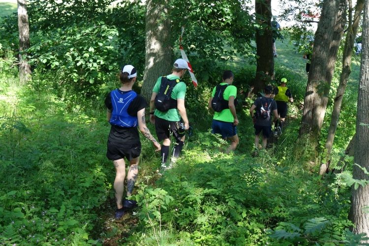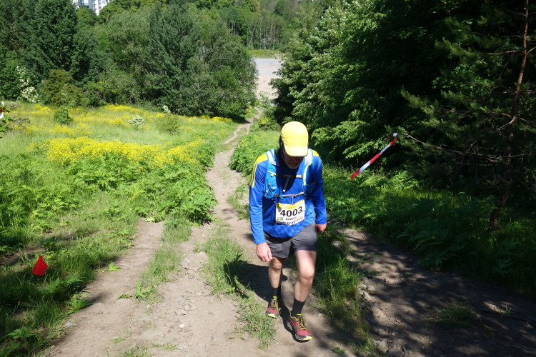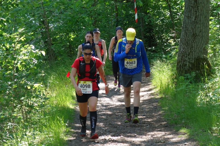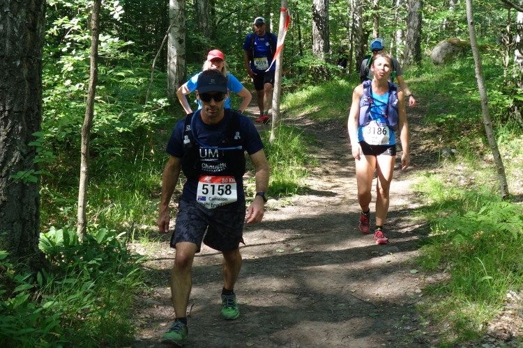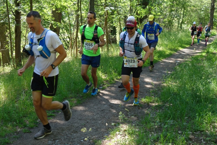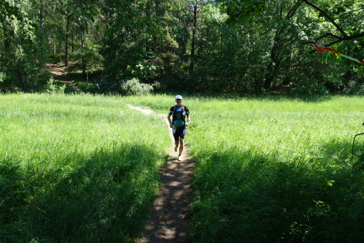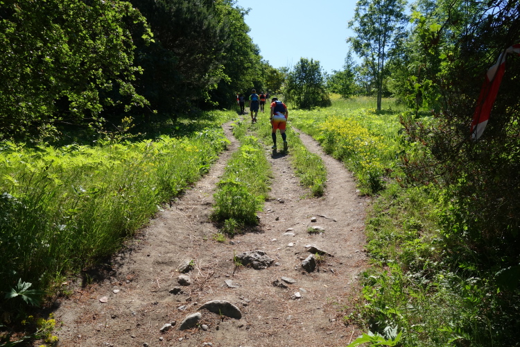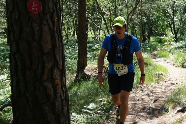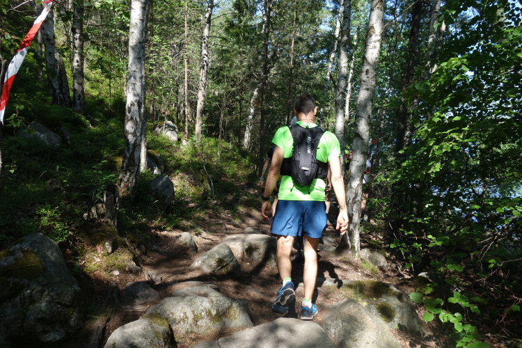 Nach dem See heißt es direkt steigen. Es geht aufwärts und das Läuferfeld zieht sich auseinander. Im Wald ist es noch temperaturmäßig erträglich. Der Untergrund fordert jedoch höchste Aufmerksamkeit. Es sind viel Steine und Wurzeln auf dem Weg. Dazu hat es vielfach Gefälle zum Wasser hin. Die Läufer vor mir agieren recht vorsichtig. Da bin ich aus den Alpen oder gar Madeira anderes gewohnt. Ich bleibe ruhig und ich verzichte aufs Überholen. Bei den Bedingungen heute heißt es ruhig Blut bewahren und Körner sparen.