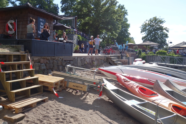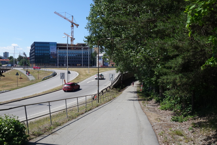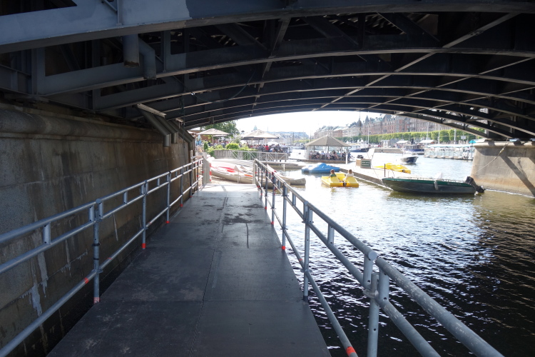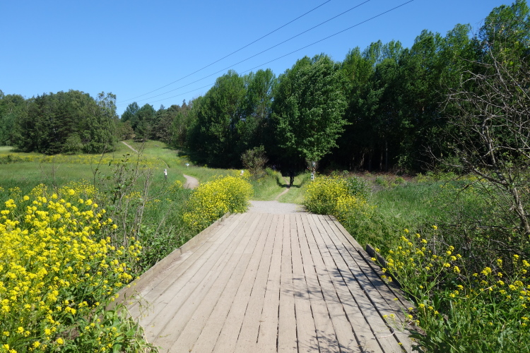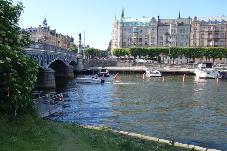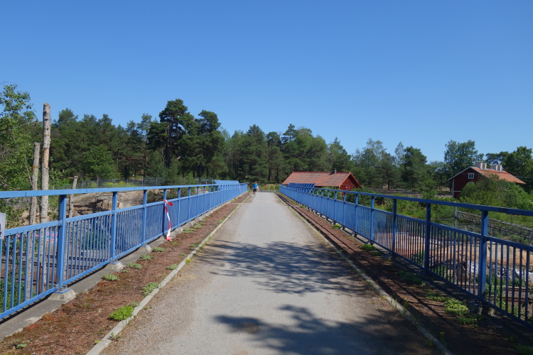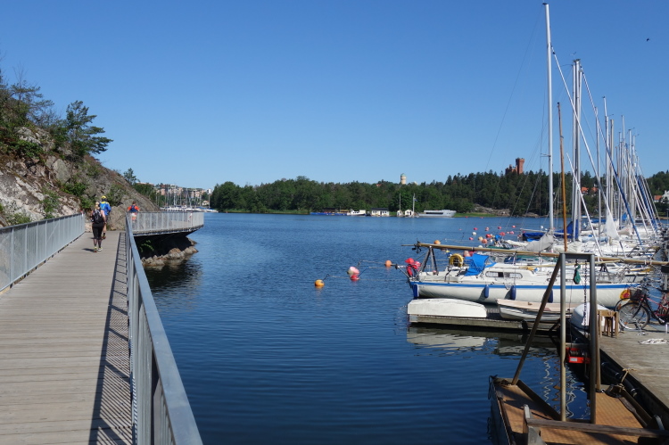 Ein erster Jachthafen wird passiert. Ein Steg führt uns an den Booten vorbei weiter. Der Wald nimmt uns wieder auf und spuckt uns an einer mehrspurigen Straße wieder aus. Wir laufen neben der Straße über die Brücke nach Bergshamra und nach der Brücke direkt wieder abwärts. In der Sonne ist es schon drückend heiß.