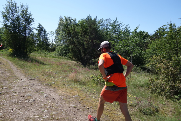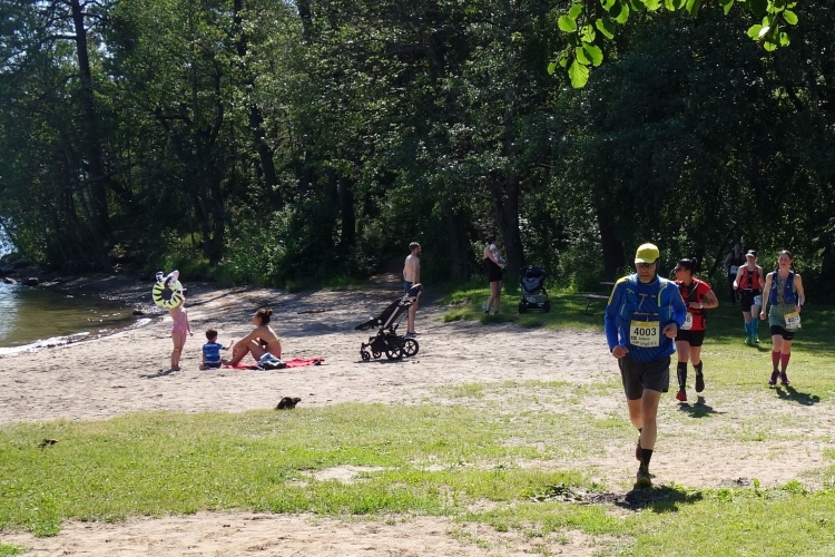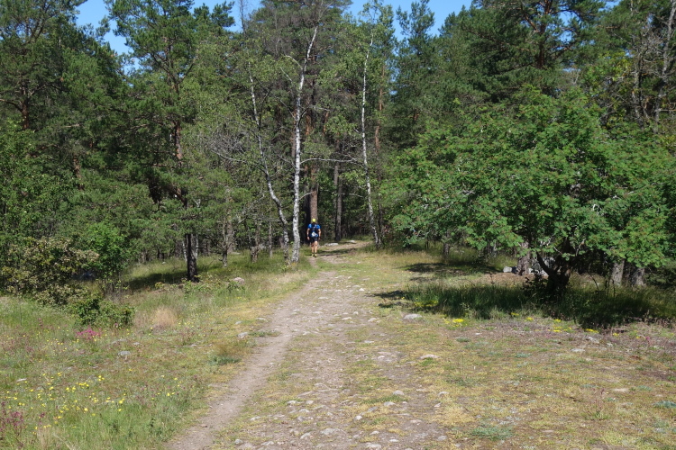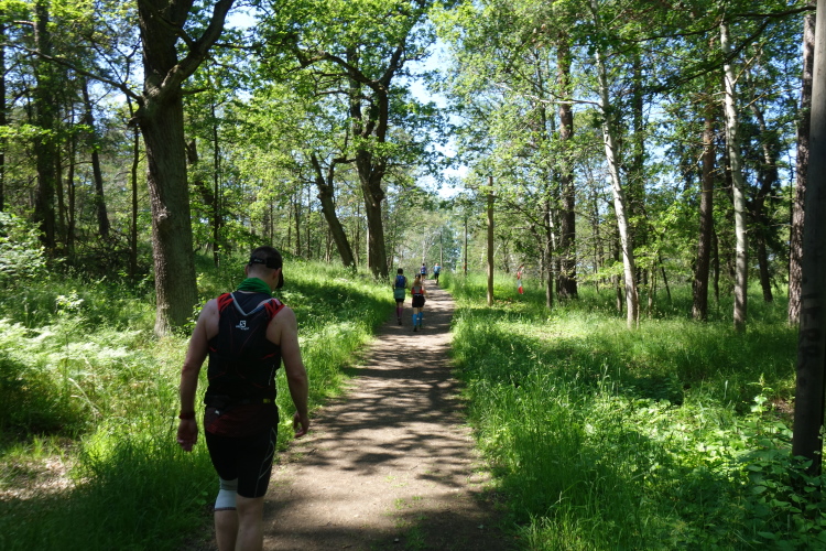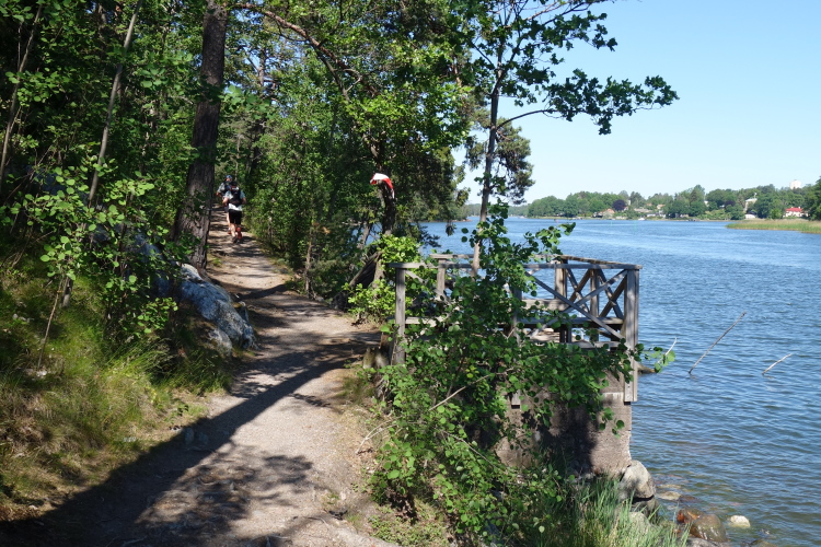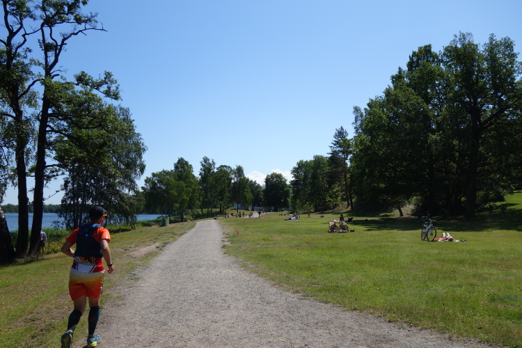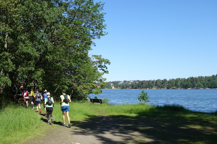Pünktlich um 10.00 Uhr fällt der Startschuss. Schon der Anfang ist vielversprechend. Es geht vorbei an einem See und durch einen Eichenwald zum Värtans Strand. Entlang des Wassers zu laufen mit wunderschönen Ausblicken, ist schon ein erster schöner Vorgeschmack auf das Kommende. Es fängt direkt mit Bilderbuch-Singletrails parallel zum Wasser an. Wow, was für ein Beginn. Ich lasse es ganz langsam angehen und bleibe am Ende des Feldes.