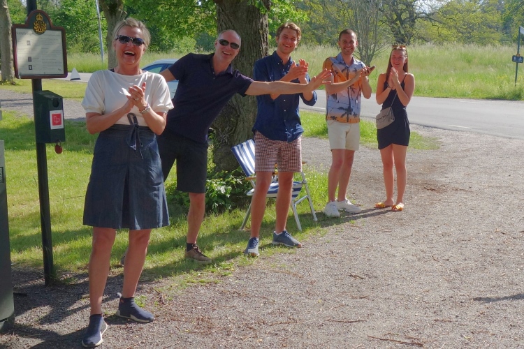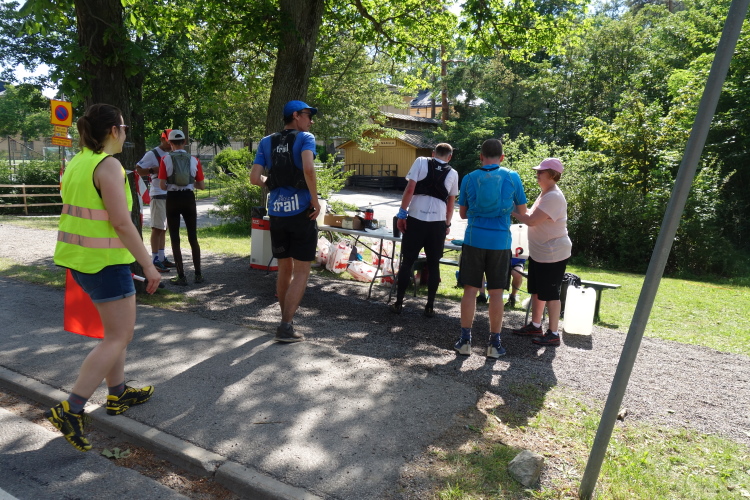 Vorher heißt es noch einen relativ steilen Anstieg zu meistern. Ein hartes Stück Arbeit, für das wir aber oben mit Applaus und einer tollen Aussicht auf Stockholm entschädigt werden. Kurz darauf kommt die ersehnte VS und es gibt Cola, andere Getränke und diverses zu Knabbern. Und Gummibärchen. Ich greife eine Handvoll Grüne ab und kleine Kuchenstücke.