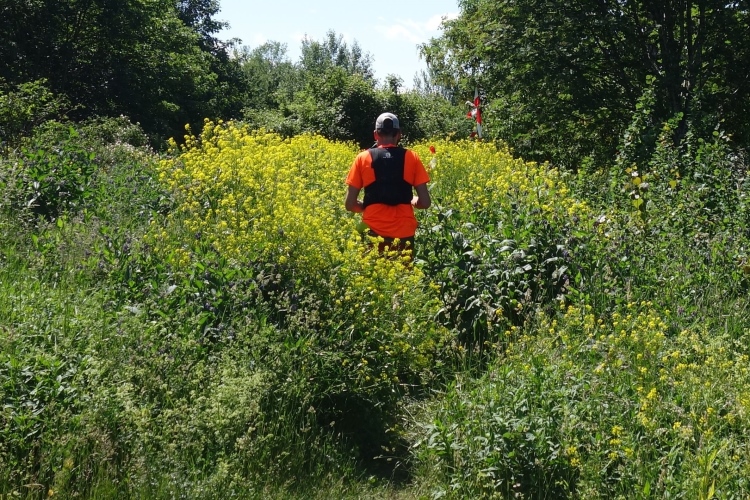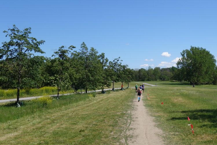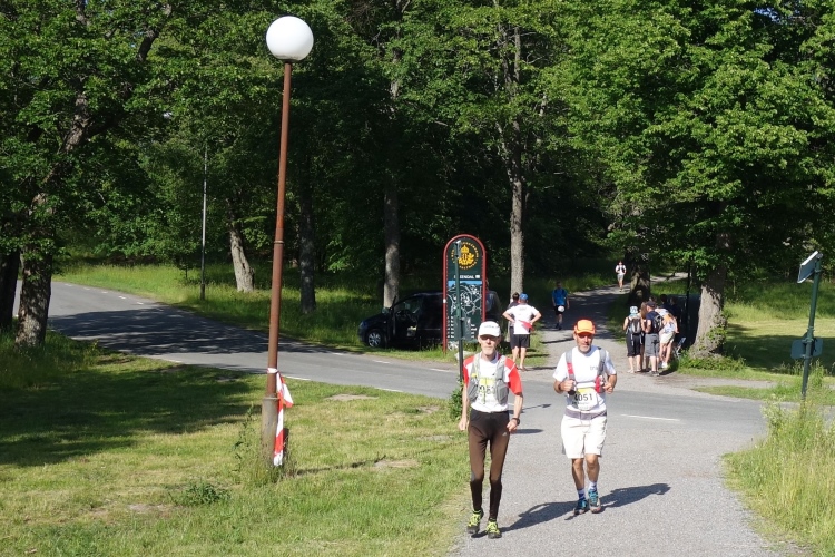 Wir Läufer werden aber vom Strand wieder in den Wald aufwärts geführt. Aber es geht voran. Wir kommen zurück in urbane Regionen und an die Haltestelle Universität der Tunnelbana. Hier sind wir am Morgen ausgestiegen und zum Start gegangen. Das heißt, das Startgelände am Stora Skuggan ist nicht mehr weit und hier gibt es beim Km 29 die zweite VS.