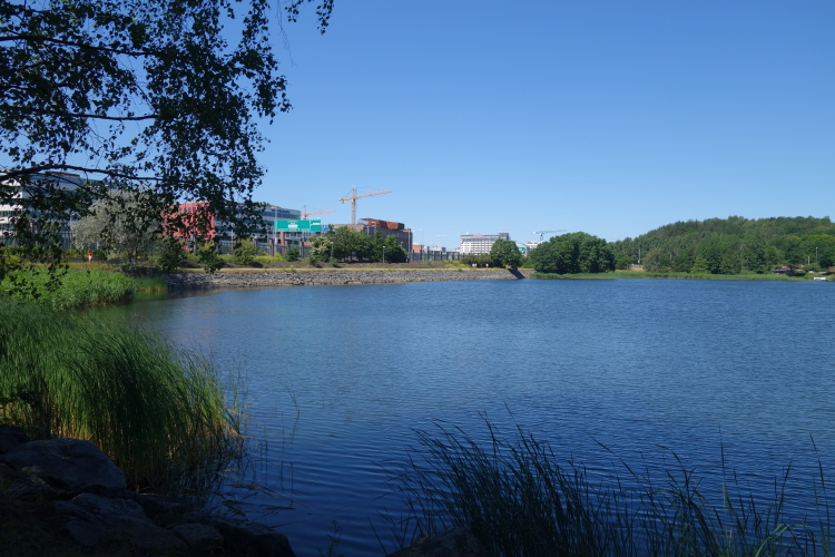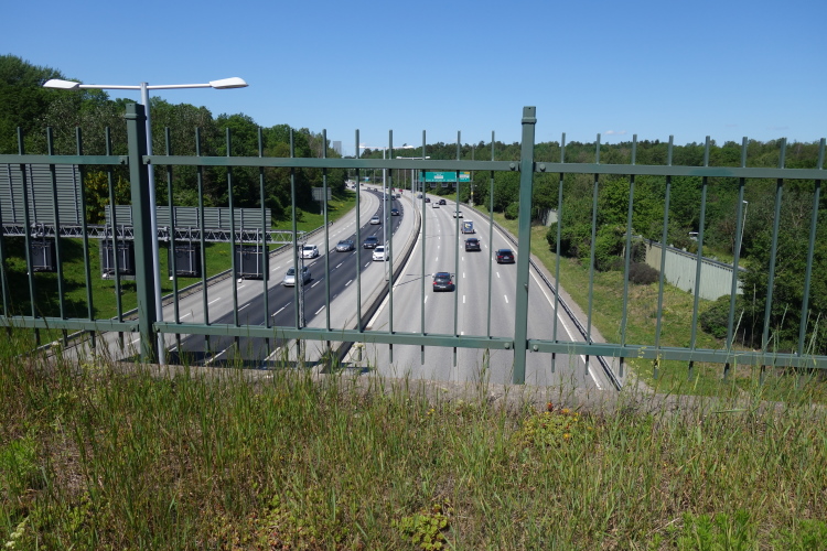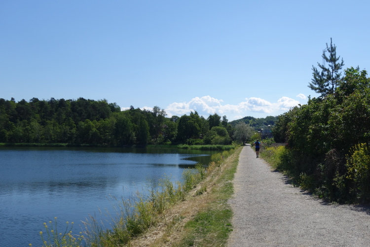 Unter und neben der Autobahn geht es wieder zum Wasser. Links von uns liegt der Brunnsviken, ein Binnensee, der einmal eine Bucht der Ostsee war. An ihm entlang laufen wir bis nach Km 25, dabei verlaufen die ersten Hundert Meter zwischen dem See und der E 18 nicht sehr spannend. Dafür ist es hier brütend heiß.
