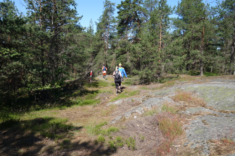 Bald wird der Strandpavillon am Lappis Beach passiert. Im Wald laufen wir oft über die typischen Gesteine dieser Landschaft. Die dicken Granitbrocken sind eiszeitlich geprägt. Das Eis hat das Gestein glatt und rund gerubbelt. Darüber zu laufen macht Spaß. Nur beim Abwärtslaufen muss man wegen etwas aufpassen, die Steine sind ziemlich glatt.