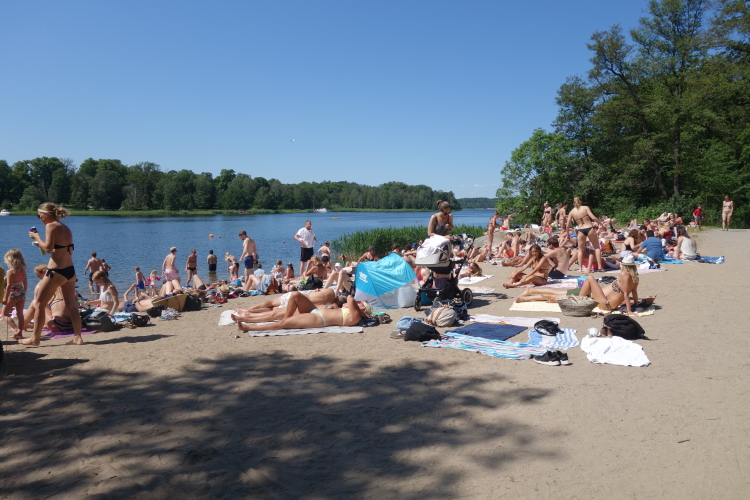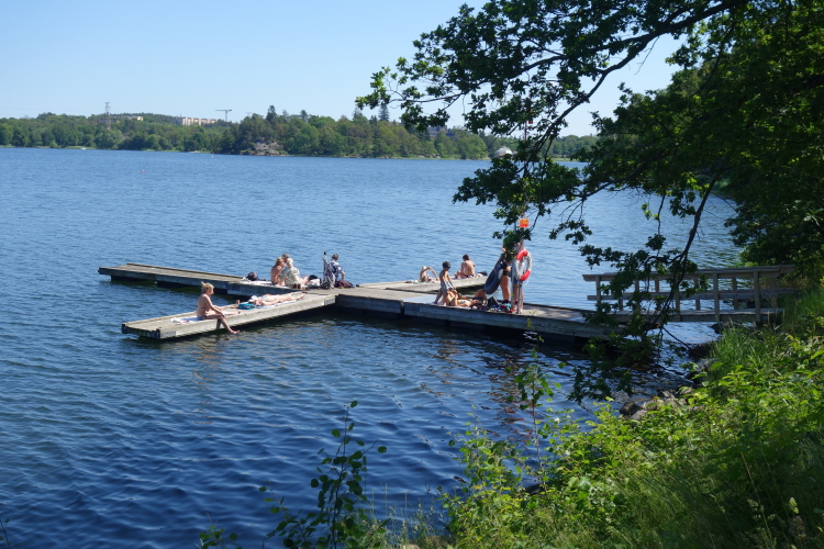 Wir kommen gefühlt an Tausenden von badelustigen Stockholmern vorbei. An unzähligen Buchten und Stränden nutzen die Menschen das Bilderbuchwetter und aalen sich im oder am Wasser. Mir stellt sich angesichts unseres exotischen Daseins als Läufer unter all den Badelustigen die Frage, ob ich heute irgendetwas in Bezug auf meine sportliche Ausrichtung falsch mache. Mentale Stärke ist gefragt.