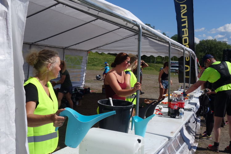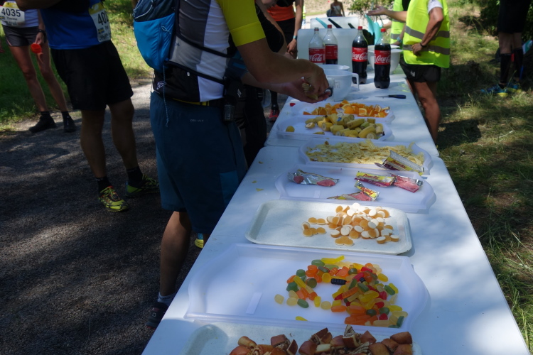 Ich leide zunehmend unter der Hitze. Dazu macht sich die linke Ferse unangenehm bemerkbar,. Aber das rechte Knie hält. Hoffentlich bleibt das so. Es geht wieder einige Meter in brütender Sonne über Asphalt. Ich schmelze dahin. Ein Schild weist auf die erste VS nach Km 22 hin. Ein Lichtblick! Bis hierhin war ich dank Trinkrucksack Selbstversorger. Aber die VS ist auch für den Kopf eine gute Hilfe.