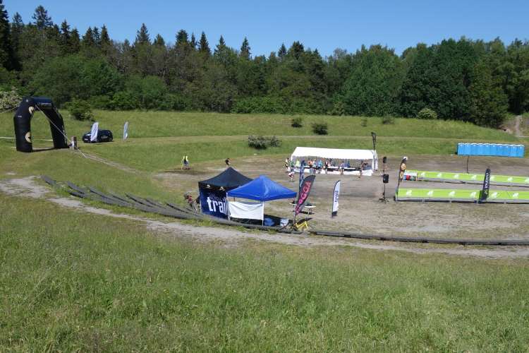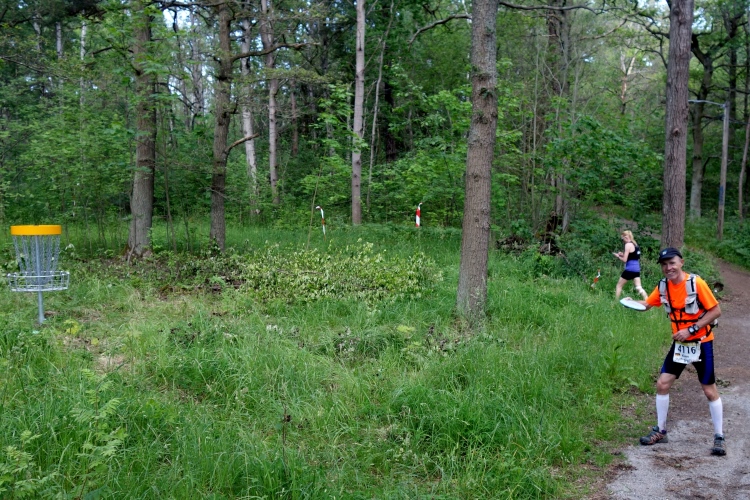 Auf einer Wiese unterhalb ist eine VS eingerichtet und ich gönne mir eine kleine Pause mit Stärkung. Wieder greife ich Cola, grüne Gummibärchen, Rosinen und Kuchenstückchen. Ein Frisbeewerfer im Wald hält mich auf. Ich muss natürlich auch mein Glück mit den Scheiben versuchen.