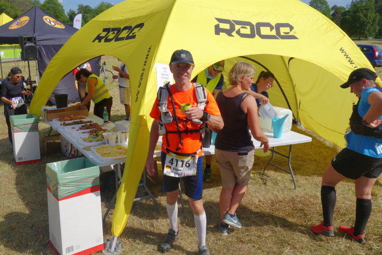 Die ersten 80er ziehen an mir vorbei. Auch einige der eine Stunde nach uns gestarteten 32er tun dies. Sie haben allerdings eine andere Streckenführung als die 45er und ich muss mir keine Sorgen machen. Allerdings mache ich schon einige Zeit immer wieder Gehpausen. Bin einfach platt und die Sonne tut ihr Übriges. Der linke Fuß tut weh, ich will ins Ziel. Und das schnell. Und da will ich ein kühles Bier. Das sage ich jedem, der sich nach meinem Befinden erkundigt. Und das macht nahezu jeder, der an mir vorbei läuft.