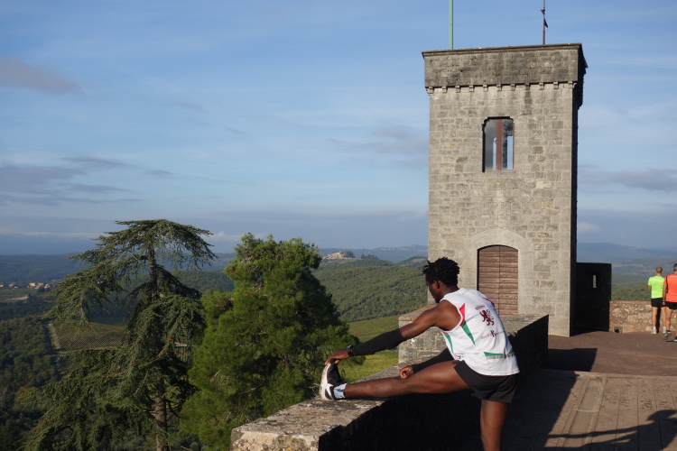 Hier im Herzen der Toskana liegt die Region Chianti und findet der Ecomaratona statt. Von unserem Quartier auf einem kleinen Hügel einen Km außerhalb Castelnuovos können wir sogar die Türme des 20 km entfernten Siena sehen. Wir sind nach unserer Ankunft sofort tiefenentspannt und schlendern in den Ort. Die ersten Schritte führen uns zur Eisdiele und dann müssen wir doch gleich einmal probieren, ob das kleine Gläschen Rotwein in der Bar noch genauso gut schmeckt wie vor zwei Jahren. Tut es!