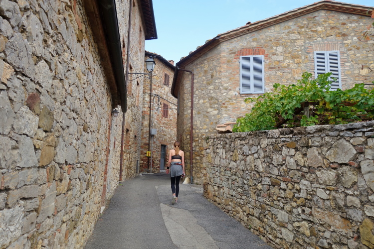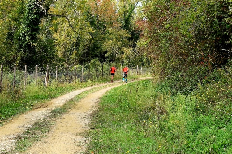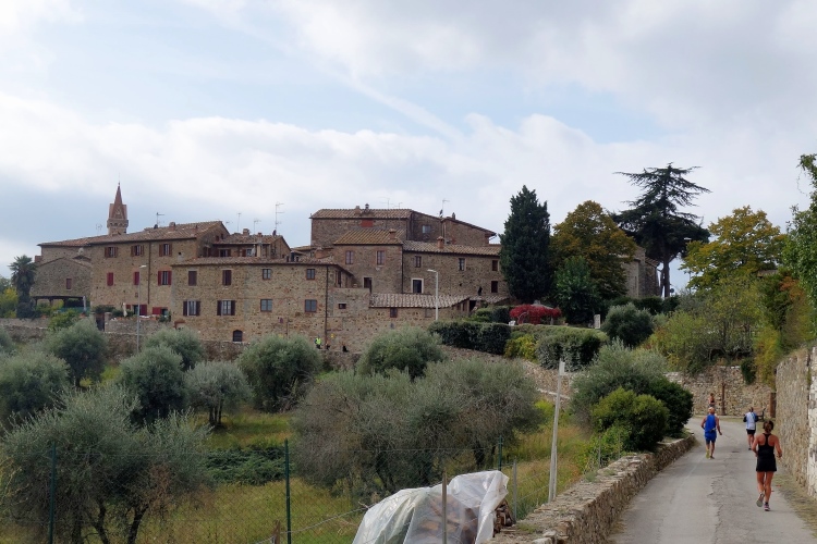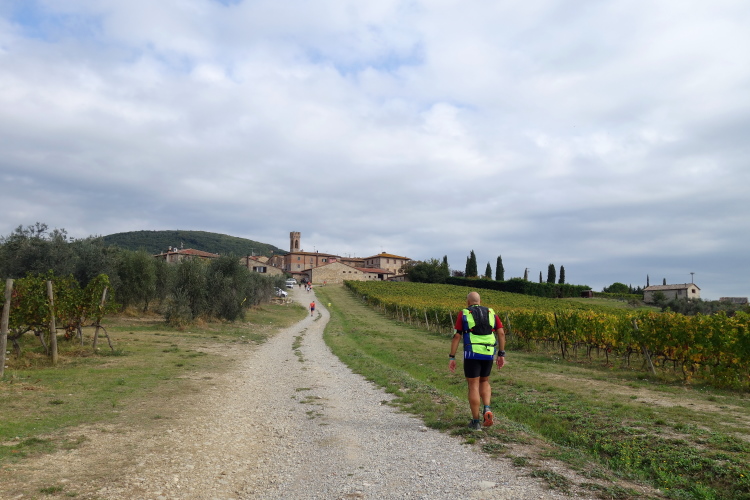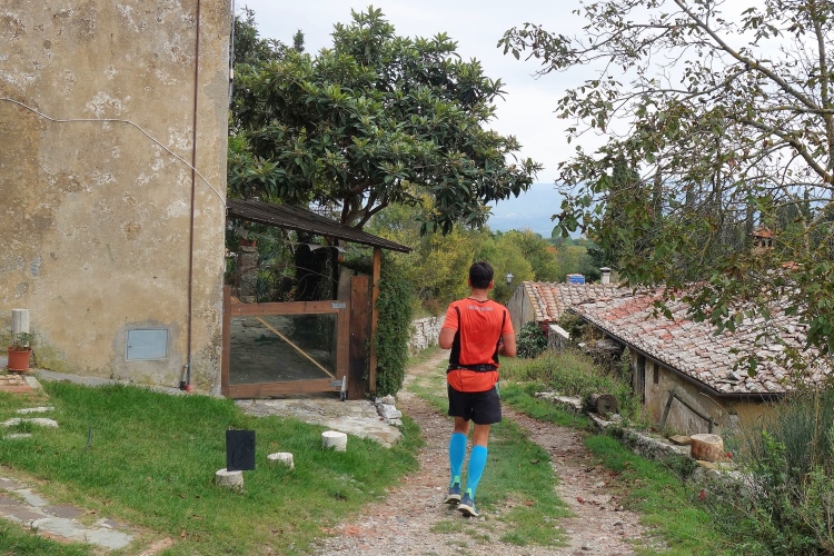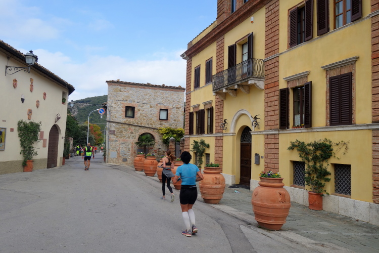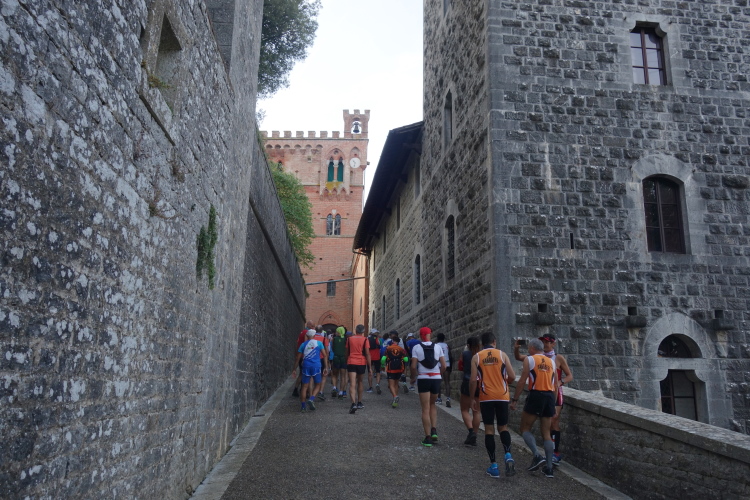 Pünktlich fällt der Startschuss und vorne geht die Post ab. Wir lassen es gemächlich angehen. Die Strecke führt uns erst einmal um das Castello herum zum unterhalb liegenden Ort Madonna a Brolio. Aus dem Ort heraus laufen wir auf Asphalt über die Landstraße. Ein Läufer mit Sandalen an den Füßen fällt mir auf.