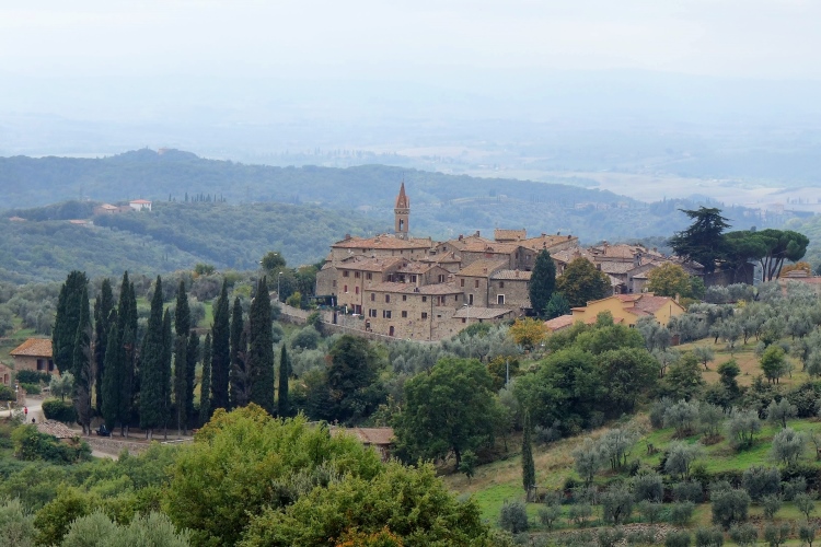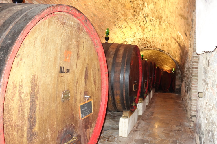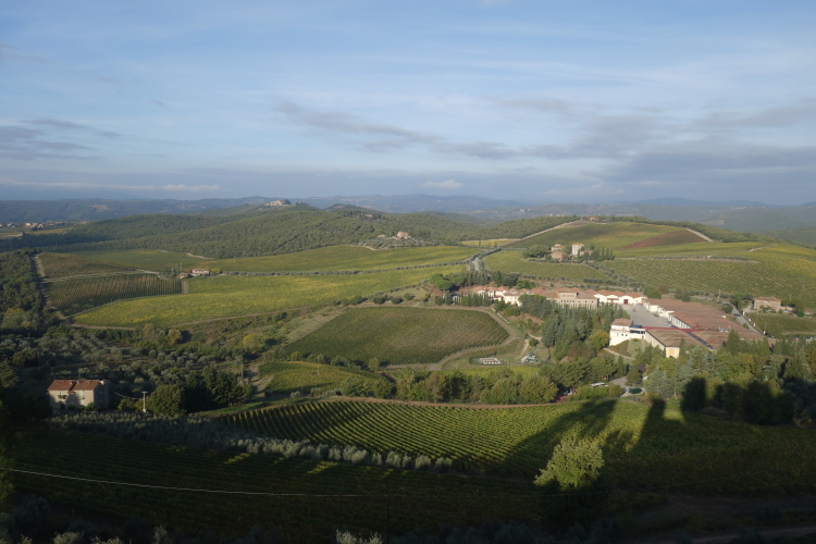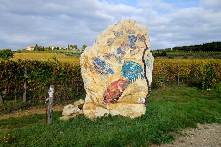 Uns umgeben große Weingüter. Ein Schild weist Barone Ricasole als Besitzer aus. Den kennen wir doch vom Castello di Brolio her. Es bieten sich uns schöne Ausblicke über die Hügel des Chianti. Hier liegt zwischen Florenz und Siena das Anbaugebiet des Chianti Classico. 1984 wurde ihm das höchste Gütezeichen in Italien verliehen: DOCG (Denominazione di Origine Controllata e Garantita). Der schwarze Hahn (Gallo nero) ist das Markenzeichen des Erzeugerverbandes. Das mage als Billigwein in großen Strohmantelflaschen ist Vergangenheit.