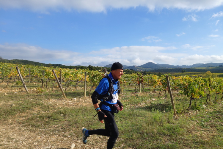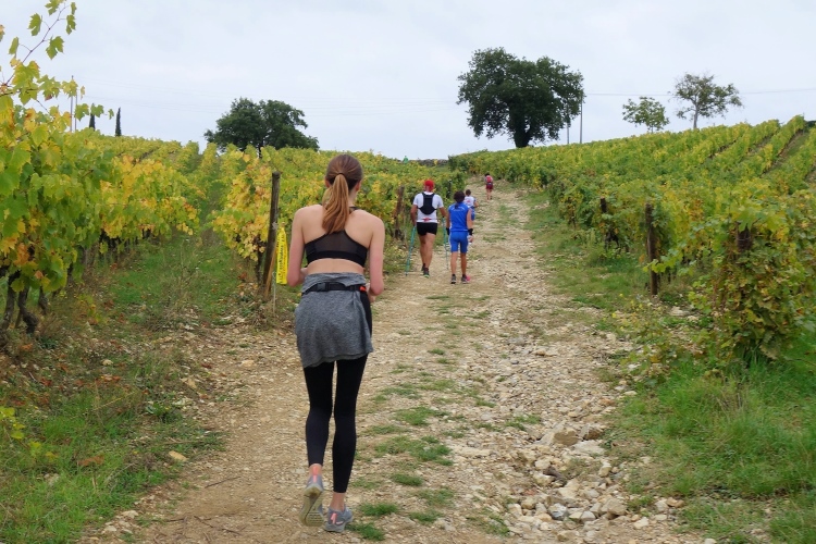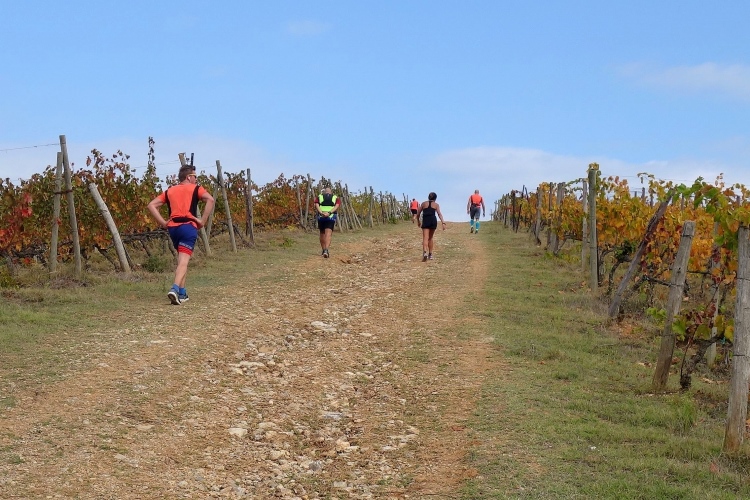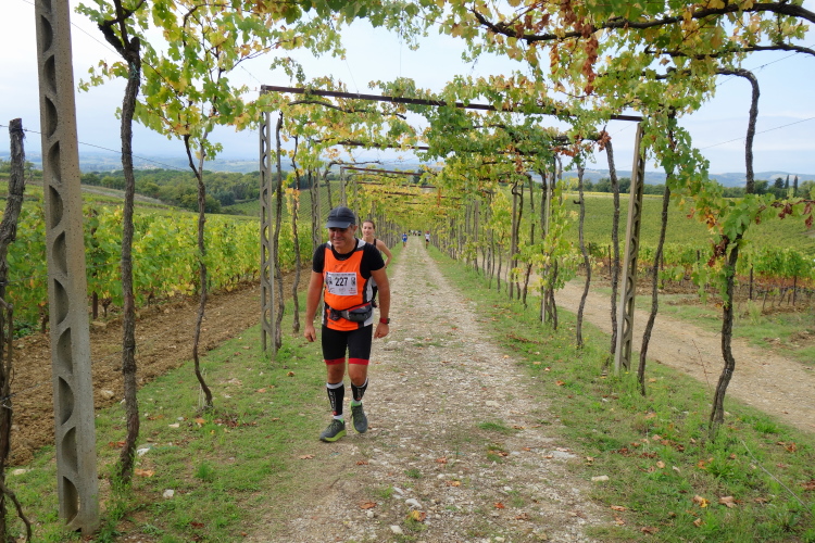 Wir haben längst die Straße verlassen und laufen im steten Wechsel die Weinberge hinauf und hinunter. Insgesamt warten heute fast 1000 Hm auf uns. Allerdings nicht in praller Sonne. Die verschwindet zunehmend hinter Wolken. Es bleibt aber trocken. Bei allzu starken Anstiegen wechsle ich in den Gehschritt, um Körner zu sparen.