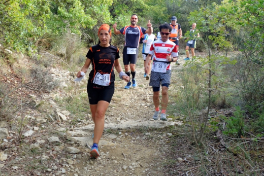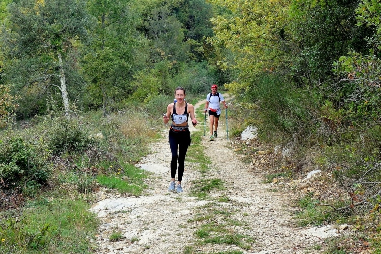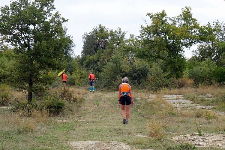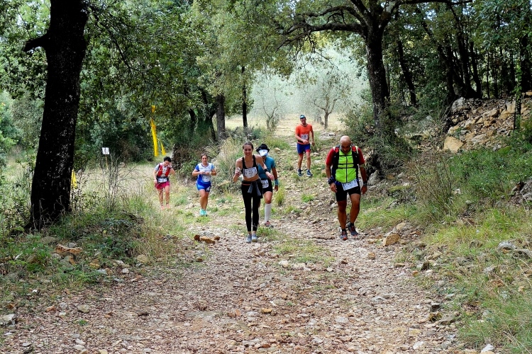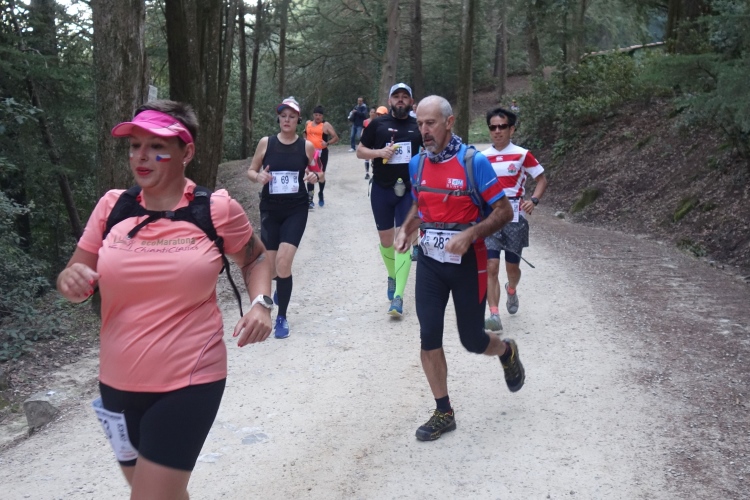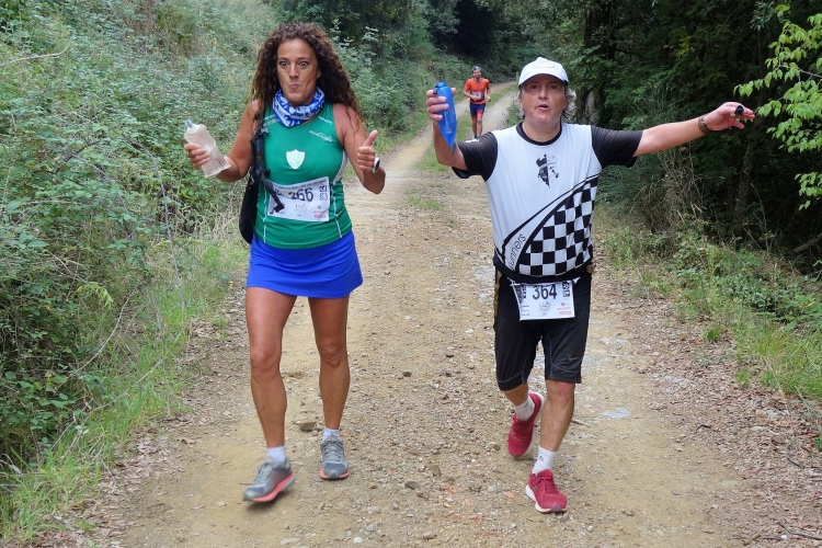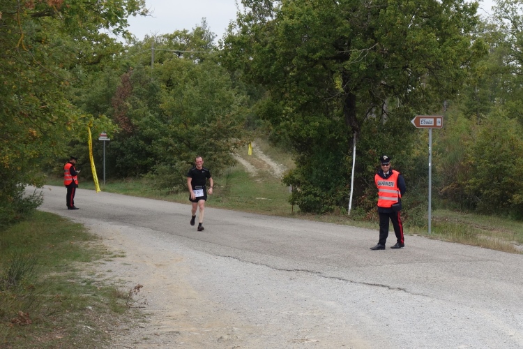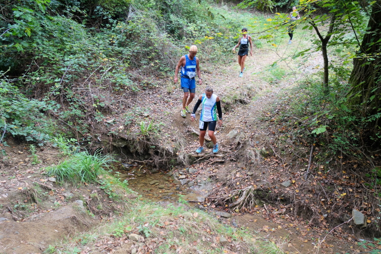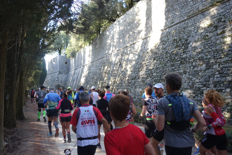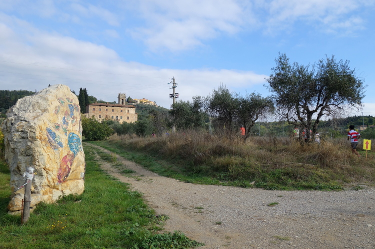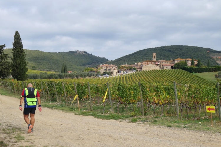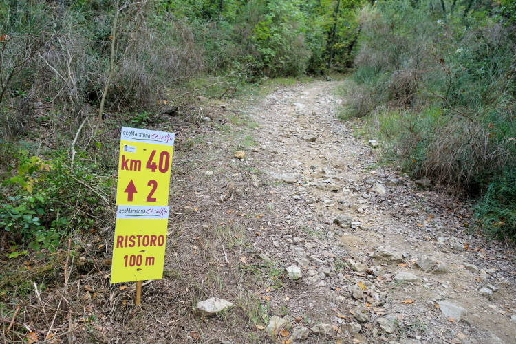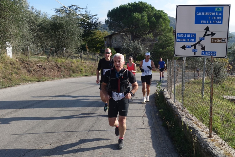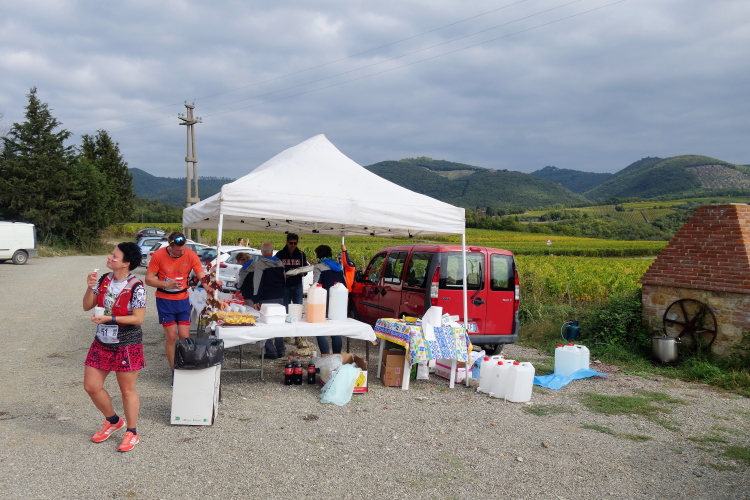 Bei San Felice können wir uns an einer VS stärken. Das nächste Zwischenziel ist schon zu sehen. Auf nach Villa a Sesta, wieder im Auf und Ab. Dafür werden wir mit einer VS im Ort belohnt. Wiederum im Schutz der Polizia Municipale queren wir die SR 484. Es beginnt ein langer Aufstieg, erst durch Weinberge moderat aufwärts, dann richtig steil durch den Wald. Das Stück habe ich noch gut in Erinnerung. Ich werde nur von vier Läuferinnen überholt und komme aufwärts. Steine erschweren den Weg.