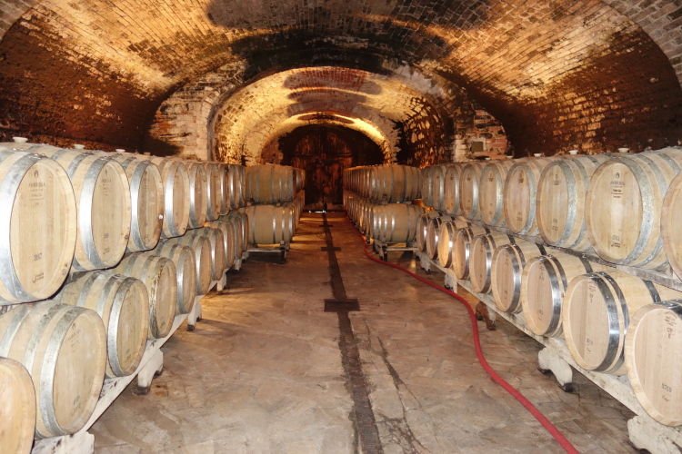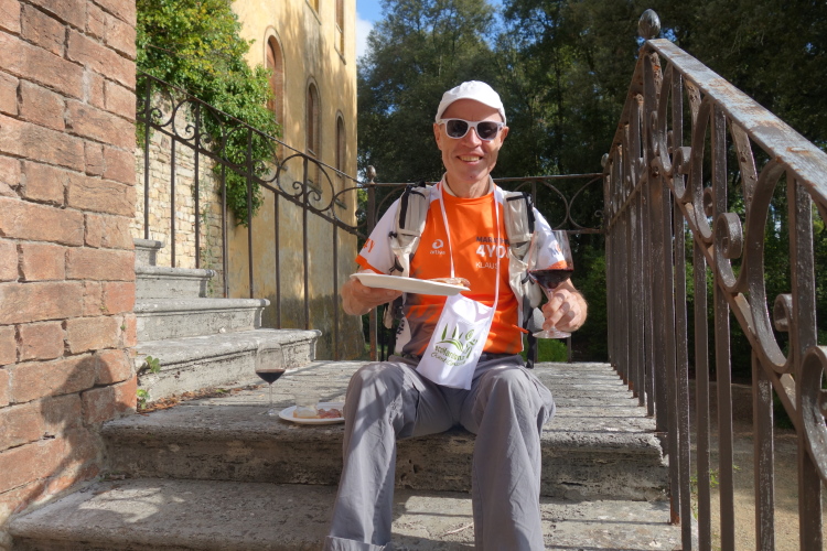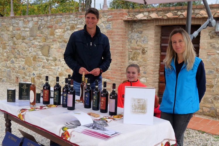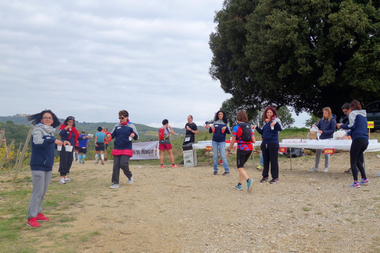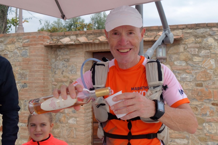 Hinaus aus dem Ort laufen wir unter hämmernder Musik durch einen großen roten Torbogen in die Weinberge. Hier war am Morgen der Start der 14er. Wir kommen zur nächsten VS. Hier bietet das Weingut Le Trosce Wein dar. Gestern auf der Genusswanderung hatte ich bereits den Wein von Le Trosce gekostet. Ich werde wiedererkannt. Natürlich muss ich den Dessertwein Vin Santo probieren. So weit ist es ja auch nicht mehr zu laufen. Der Wein schmeckt verlockend. Karl-Heinz wird hier etwas später noch einen hervorragenden 2011 Chianti Classico Gran Reserva genießen. Ein Spitzenwein der ihn einiges an Laufzeit kostet. Oder hat ihm der Wein den Turbo geöffnet für die letzten Km?