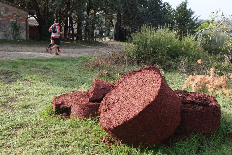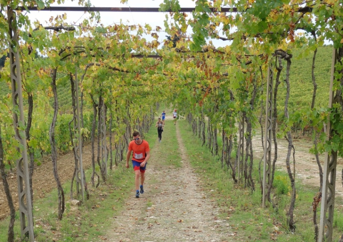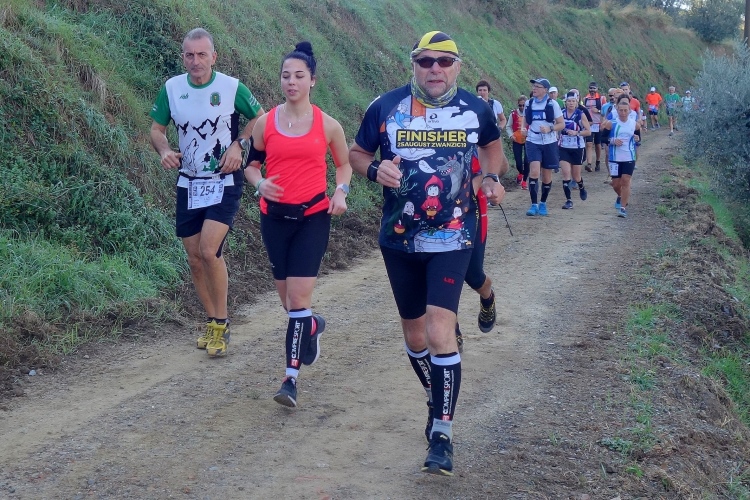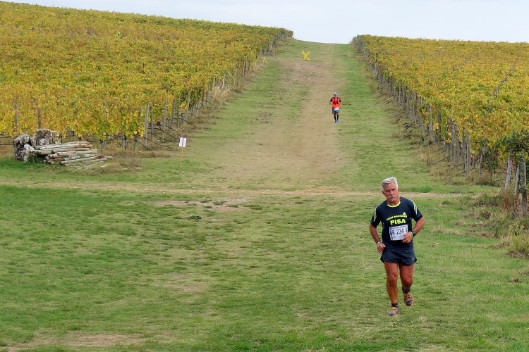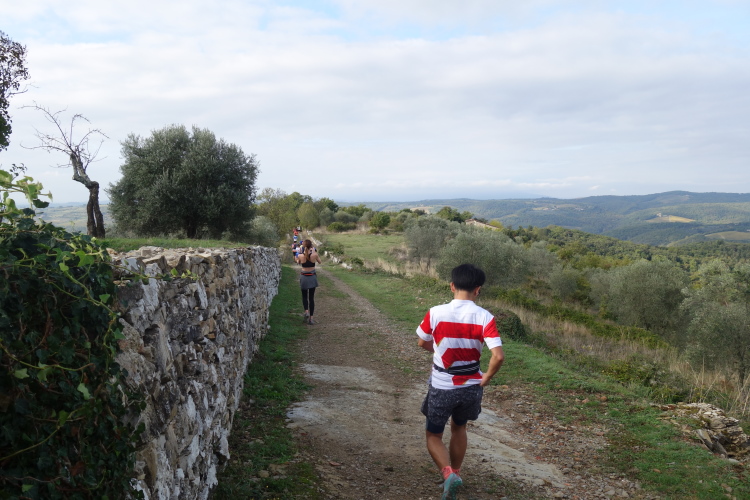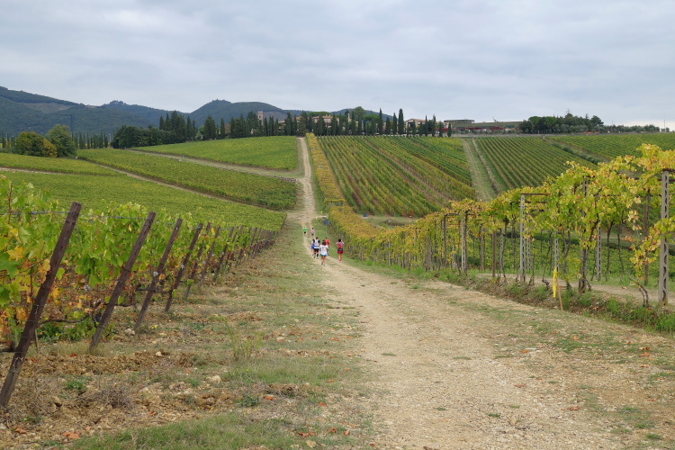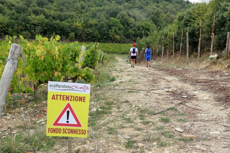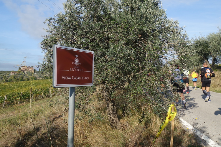 Es ist genug Platz zum Laufen, das Läuferfeld ist schon weit auseinander gezogen. Einige Stellen sind sehr steil, wovor auf Schildern gewarnt wird: Attentione: Fondo Sconnesso. Ich kontrolliere das Abwärtslaufen und gehe kein Risiko ein. Ich will Spaß haben und den Lauf genießen. Und das tue ich. Herrliche Blicke tun sich auf. Wir laufen entlang unzähliger Weingüter. Neben Weinbergen sind auch viele Olivenhaine an der Strecke.