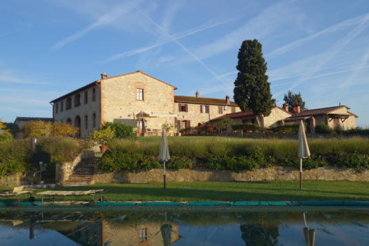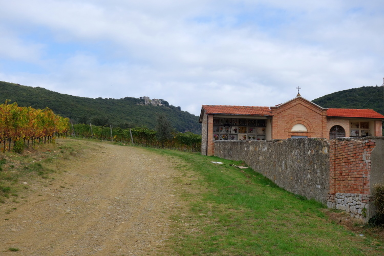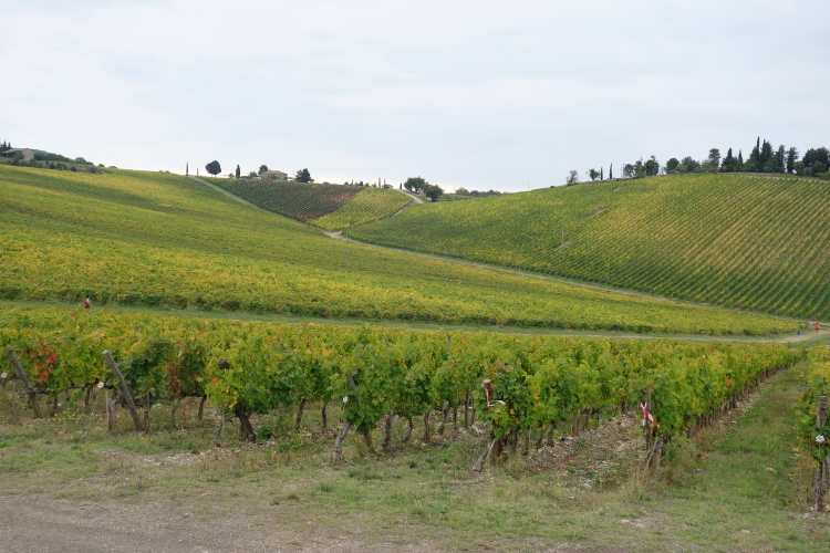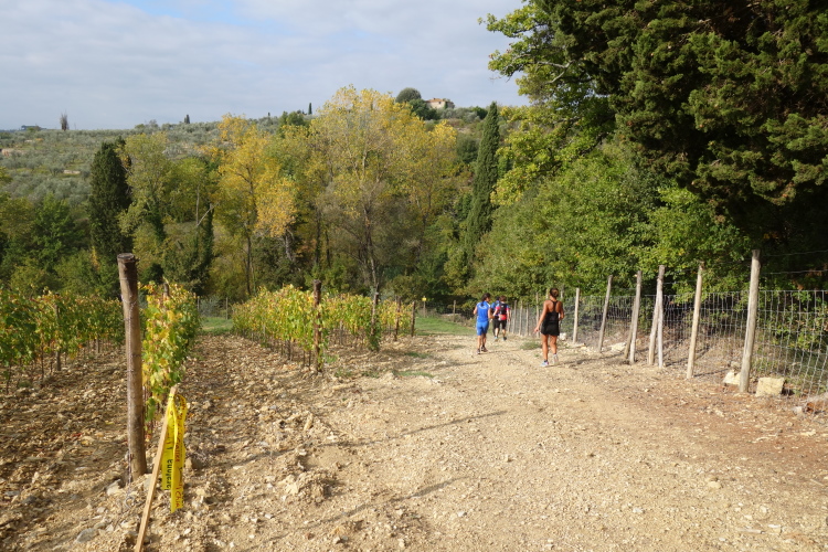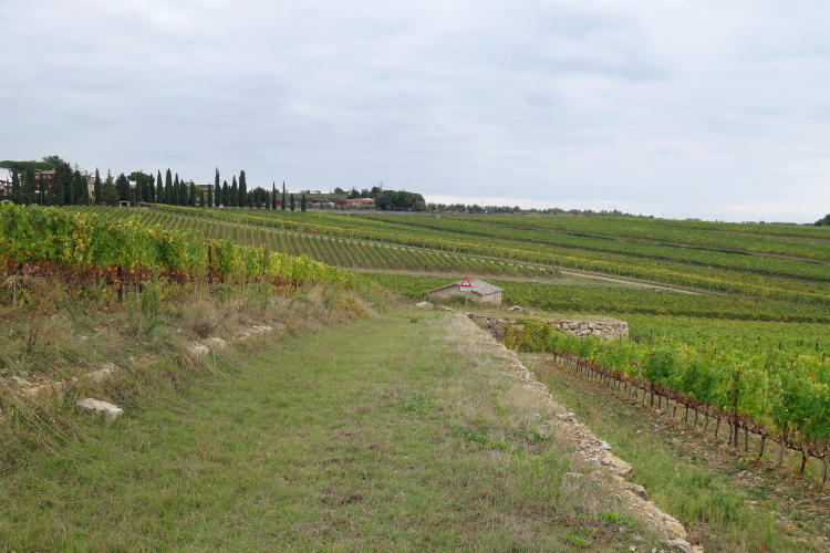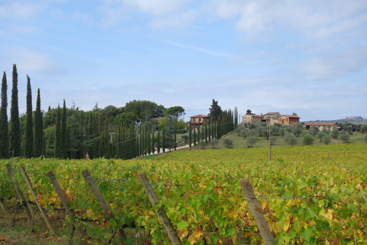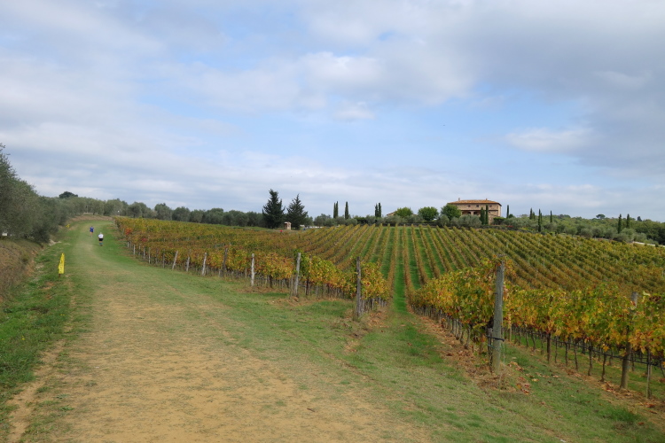 Vor Borgo San Felice laufen wir an einer sehr schönen Ferienherberge vorbei. Sieht nicht gerade billig aus. Es gibt hier wunderschöne Anlagen. in denen man richtig viel Geld lassen kann. Diese hier hat sogar einen eigenen Hubschrauberlandeplatz. Ein echter Hingucker ist ein zu durchlaufendes Weinspalier. Nicht nur ich mache hier Fotos.