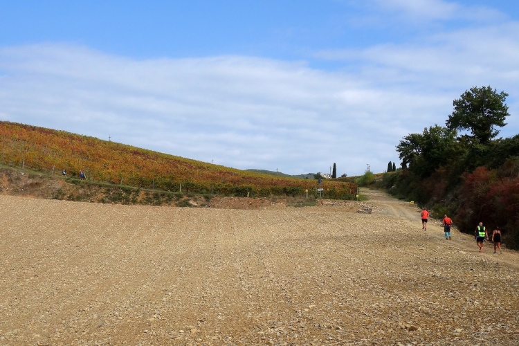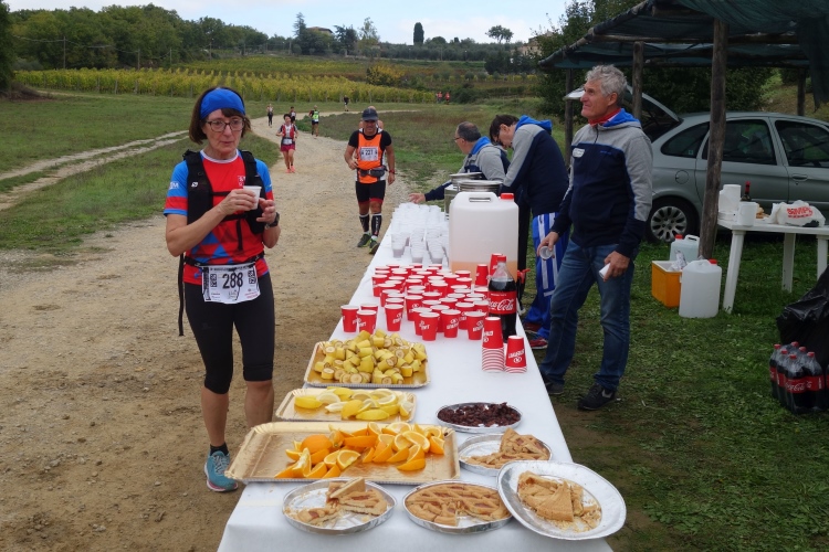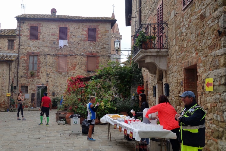 Der weitere Weg nach Castelnuovo Berardenga ist mir bestens bekannt. Auf breiter Schotterpiste nähern wir uns dem Ziel. Es gilt auch mehr hinab als hinauf zu laufen. Das kommt meiner körperlichen Verfassung sehr entgegen. Aber eine letzte längere Steigung wartet nach Km 39 noch auf uns. An deren Ende werden wir mit der letzten VS belohnt. Ein Doktor am Beginn der VS mustert aufmerksam jeden ankommenden Läufer.