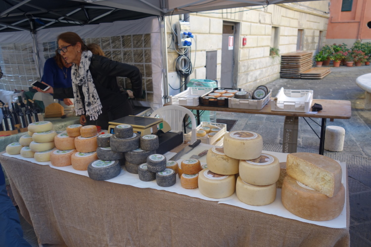 Wieder auf der Piazza Marconi gehen wir über die Expo. Es duftet nach lokalen Spezialitäten. So mancher Wein wird verkostet und so manche Flasche Wein wechselt den Besitzer. Es gibt Käse in vielen Variationen und, und, und. Alles sieht lecker aus und riecht gut.