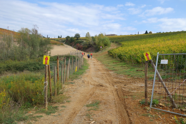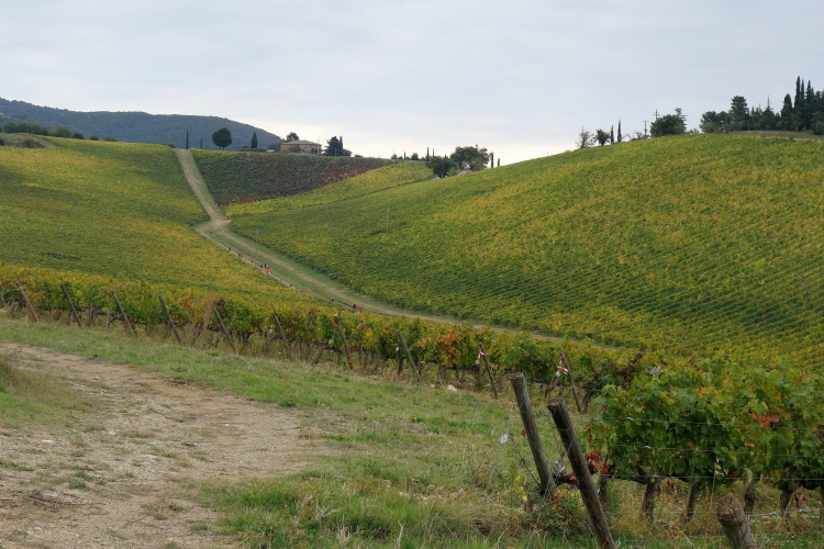 Castello Lucignano wird rechts liegen gelassen. Eine weitere VS bietet willkommene Labung. Es geht einen Hügel hinauf. Über Steine und durch das Gebüsch führt ein gut laufbarer Weg. Eine Straße wird aufmerksam gesichert gequert. Hinweisschilder weisen auf das Castello di Brolio. Da waren wir aber schon heute Morgen, also halten wird uns etwas südlich.