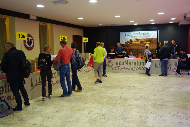 Am Freitag gehen wir zur Startnummernausgabe und holen unsere Startunterlagen. Ein medizinisches Zeugnis wird seit kurzem in Italien nicht mehr verlangt. Im Starterbeutel sind wieder viele schöne Sachen. So gibt es eine Flasche Chianti Classico, ein Shirt und Socken.