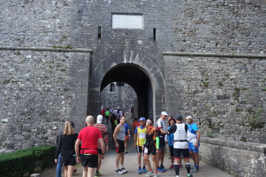 Nun aber rasch zum Start. Der Blick von der massiven Schlossmauer hinunter auf das Starterfeld ist beeindruckend. Das hat was. Sogar ein kleiner Hund freut sich auf den Start. Kurz vor dem Start werfe ich noch alte Kleidung ab die mich warmhalten sollte. Die Sonne scheint und es verspricht ein richtig schöner Tag zu werden.