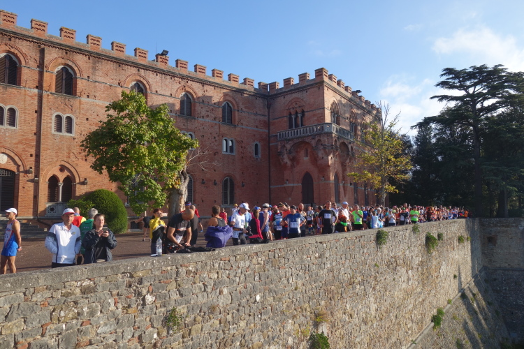 Entspannt nehmen wir früh am Lauftag den Shuttle-Bus zum Start am beeindruckenden Castello di Brolio. Hier startet um 9.30 Uhr der Marathon. Um diese Zeit dürfen auch die Halben und die 14er auf die Strecke. Allerdings von Castenuovo Berardenga die Halben und die 14er von San Gusmé. Das Ziel aller Läufe ist die Piazza Marconi in Castelnuovo Berardenga.