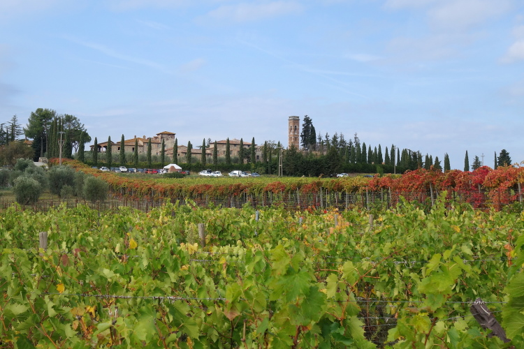 Samstag steht ganz im Zeichen des Genusses. Wir wandern im Rahmen des Begleitprogramms von Weingut zu Weingut. Es gibt eine Neuerung. Statt des "Passeggiando per cantine" werden nunmehr im Rahmen des "Emozioni nelle cantine" zwei Genusswanderungen angeboten. Zur "Emozioni Chianti Classico" muss man mit dem Bus zum Start fahren, das Ziel ist auf der Piazza Marconi in Castelnuovo. Wir entscheiden uns für die Genusswanderung "Emozioni Castelnuovo". Hier liegen wie beim alten Passeggiando Start und Ziel auf der Piazza Marconi in Castelnuovo. Ab 09.10 Uhr starten im Stundenrhythmus die Gruppen genusswilliger Läufer.