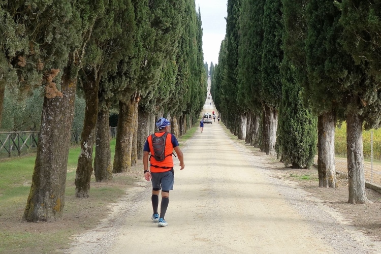 Das nächste Weingut liegt auf unserem Weg. Die Tenuta di Arceno wird passiert. Und es wartet ein weiterer Höhepunkt der Strecke auf uns. Nach dem Weingut geht es rechts hinauf entlang einer beeindruckenden Zypressenallee. Einfach grandios dieser Kilometer. Immer wieder nur schön, trotz der Plackerei. Zuerst bin ich noch im Laufschritt, dann werde ich ob der Steigung zum Geher. Puh, das kostet wieder Körner. Schließlich sind wir oben schon bei Km 36. Aber eine VS bietet im rechten Moment Stärkung.