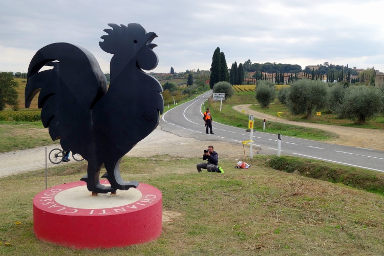 Es geht abwärts, Castelnuovo ist schon zu sehen. Vorbei am markanten schwarzen Gockel und über die Straße, auf der anderen Seite wartet der Ultimo KM auf uns. Kurz vor dem Weingut Festina müssen wir noch einmal abwärts, um im Ort noch eine letzte kurze Steigung zu meistern. Der kurze Stich tut weh. Aber dennoch genieße ich die letzten Meter auf abgesperrter Straße.