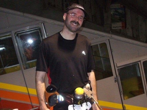 GUCKEN und dabei die Treppe unter die Füße zu nehmen – das harmoniert einfach nicht. Ich bleibe stehen – mein rückwärtiger Laufkollege schließt auf. Zisch vorbei, ich will mal’n Bild machen“, sage ich locker! Er retourniert noch lockerer: „Kumpel, ich überhole hier keinen mehr – ……ich bin der Besenwagen“. „Nee…..“! „Doch“, entgegnet er schmunzelnd und dreht sich rum. Auf seinem Rücken prangert tatsächlich ein Schriftzug mit BESENWAGEN drauf. Ich halt’s nicht aus, das gibt aber ein reichliches Kopfproblem für mich. Nix ist mehr mit Lockerheit. Da gibt’s nur noch die verkrampfte Flucht nach vorn. Also alles mobilisieren, was noch so an Reserven abrufbar ist.