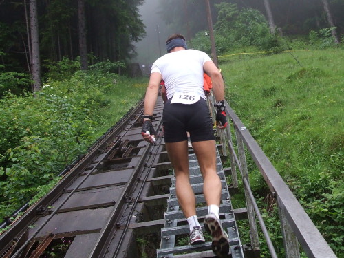 Und wieder bin ich im Tritt. Einige hundert Stufen weiter versuche ich’s PROBEHALBER in gebückter Haltung – die Arme scheinen fast die Treppenstufen zu berühren. Sieht irgendwie beknackt aus. Nee, wir wollen schon in gewisser Ästhetik den Berg hoch. Ich muss mal versuchen, mich abzulenken. Wenigstens kann ich mich hier nicht verlaufen. so wie damals im Westerwald, als ich 50km abspulen wollte und nach 10km schon wieder im Ziel / am Start war. Immerhin hatte ich damals im zweiten Anlauf auf die 50km die Brigitta Biermanski kennengelernt, die in 2003 die 5.100km messende Strecke Lissabon-Moskau in 64 Tagen gelaufen ist.