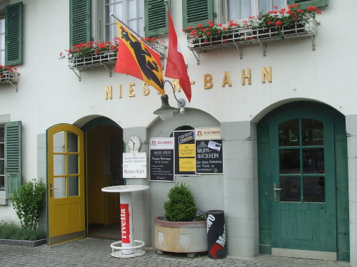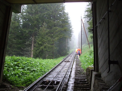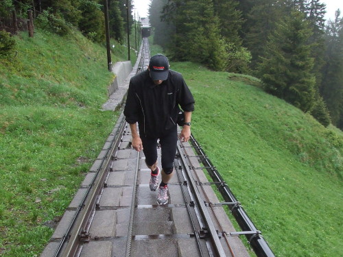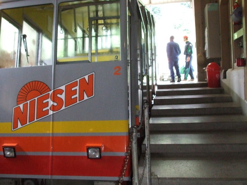 Nun stehe ich denn hier an der Talstation der Standseilbahn in Mülenen, die fast bis auf den Gipfel des 2.362m hohen NIESEN schleicht. Das ist an und für sich nix ungewöhnliches in den Bergen – das Alleinstellungsmerkmal gerade dieses Berges/ dieser Bahn rührt daher, das neben der Bahntrasse eine Wartungsstrecke verläuft, die aus ziemlich genau 11.674 Treppenstufen besteht. Es ist nüchtern betrachtet die längste Treppe der Welt, die noch dazu mit einer maximalen Steigung von 68% glänzen kann.