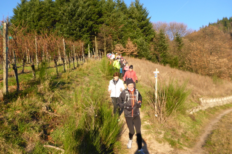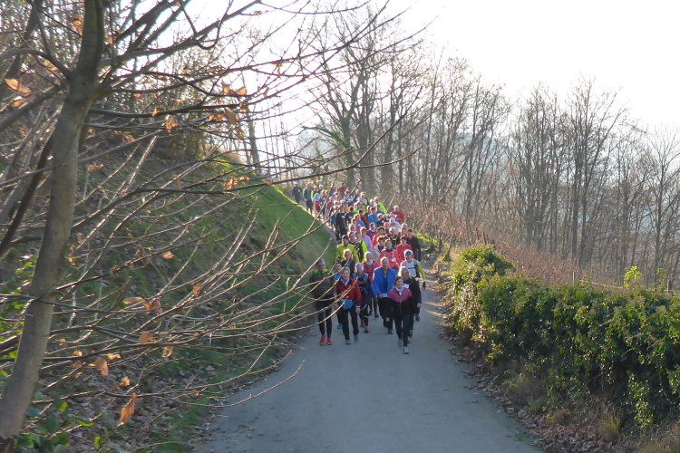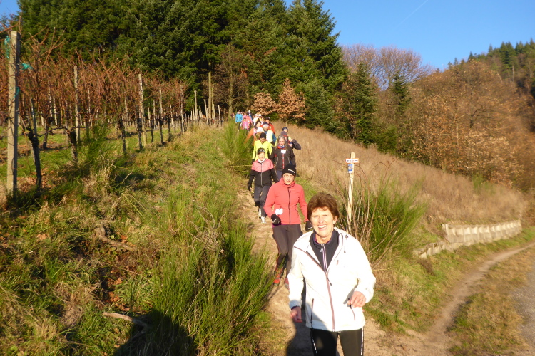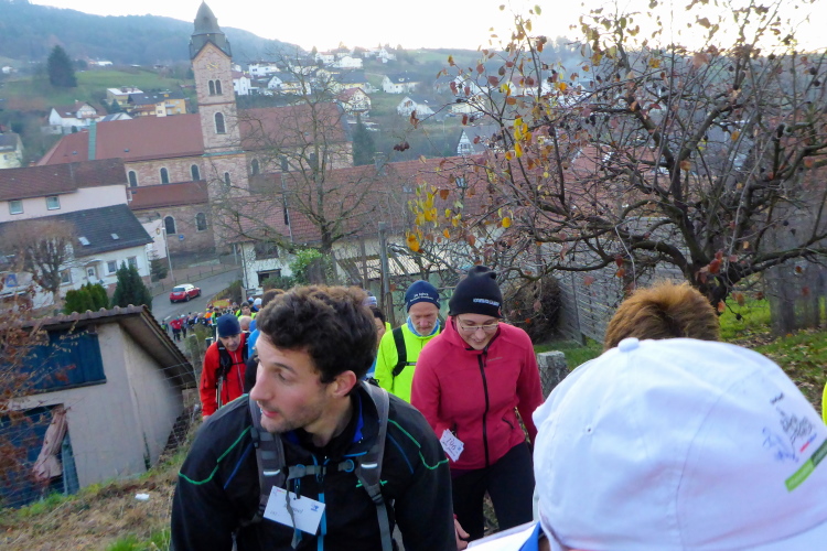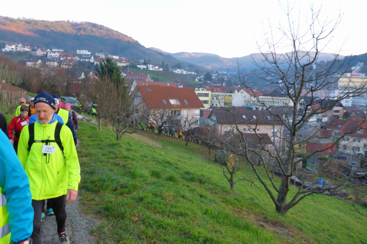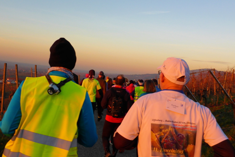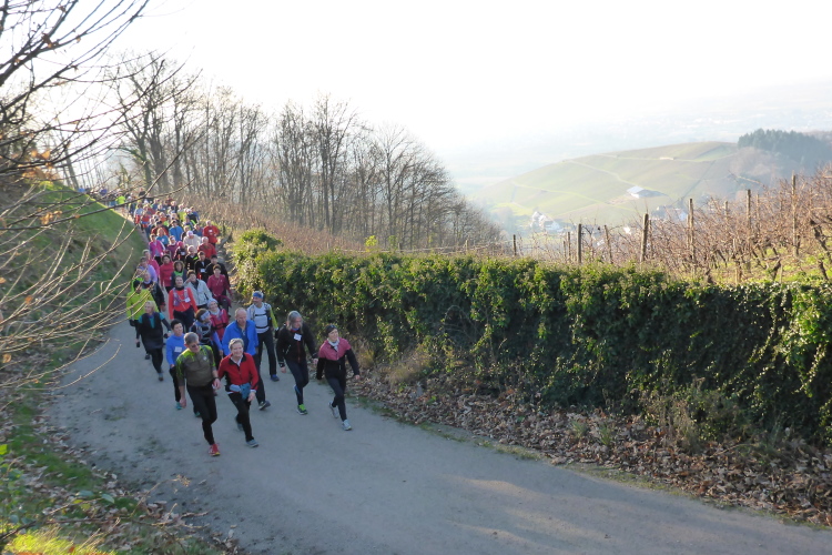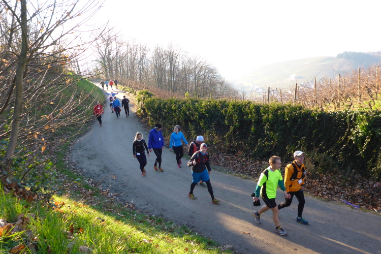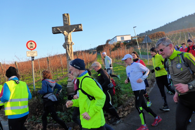 An jedem Verpflegungspunkt kann man Einsteigen. So kommt es, dass aus 80 Startern am Morgen 180 Finisher am Abend auf dem Weihnachtsmarkt in Baden-Baden werden. Die Strecke führt meist auf dem Ortenauer Weinpfad entlang. Dieser verläuft parallel zur badischen Weinstraße, allerdings oberhalb über die Weinberge hinweg, was in der Summe zu stattlichen 1800 Höhenmetern führt. Aber keine Angst: Anstiege werden gegangen und Brigitte Mahlburg als Führerin sorgt dafür, dass auch jeder mitkommt. Guter Trainingszustand für die angepeilte Streckenlänge ist trotzdem notwendig, denn hoch muss man, auch bei moderatem Tempo, erst einmal kommen.