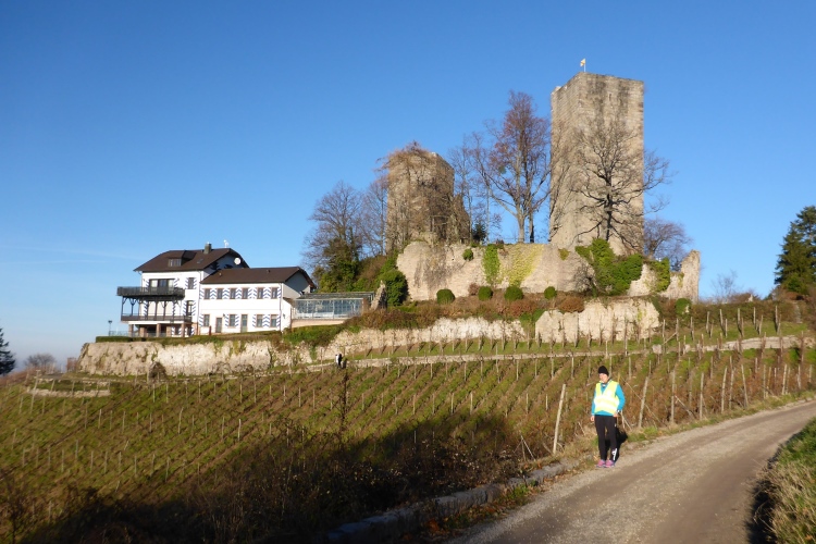 Laura und ich steigen an der 4. Verpflegungsstelle ein. Diese liegt im Schatten der Burg Windeck über dem Bühler Stadtteil Kappelwindeck. Die schmale Zufahrtsstraße ist ziemlich steil. Oben gibt es ein Hotel, das auf die ursprünglichen Gebäudeteile der Vorburg gebaut wurde. Außerdem laden ein Panorama-Restaurant, Cafe und Vesperstube mit großer Terrasse und herrlichem Ausblick nach Bühl, in die Vogesen, ins Rheintal und die Ortenau die Gäste aus Nah und Fern.