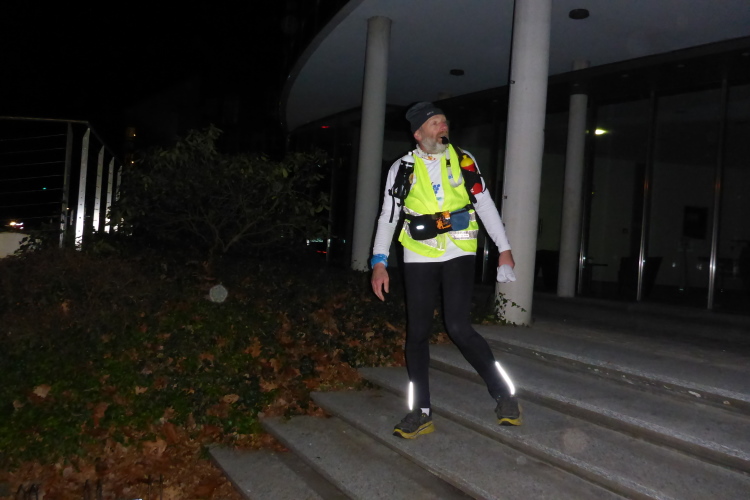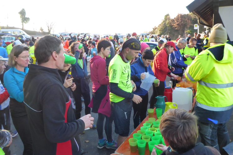 Gerne kann man auch morgens anreisen oder direkt nach Offenburg zum Startpunkt am Bahnhof kommen. Dieser erfolgt dort um 8 Uhr. Auf der ca. 63 km langen Strecke werden 5 Stopps eingelegt. Das eingespielte Team von Helfern hat dann schon Verpflegung vorbereitet, die seines Gleichen sucht. Es gibt wirklich alles was man sich nur vorstellen kann: Weihnachtsstollen, Früchtebrot, Honigkuchen, diverse Kekse, Kartoffeln, saure Gurken, Oliven, Studentenfutter und noch vieles mehr. Dazu Tee, Bier mit oder ohne Alkohol, Malzbier und ab der dritten VP auch Glühwein. Außerdem liegen da auch die abgegebenen Taschen der Reihe nach bereit, so dass man seine Kleidung wechseln kann.