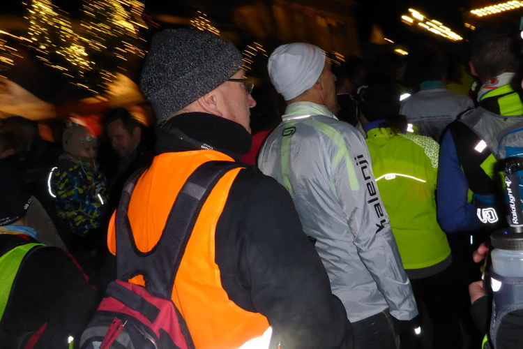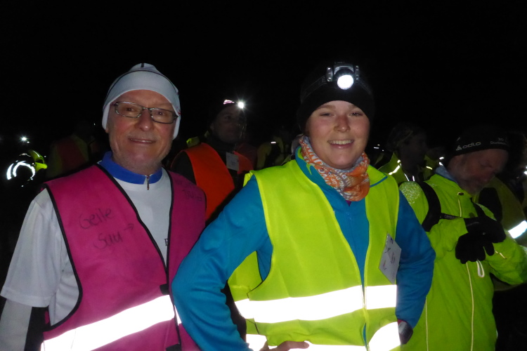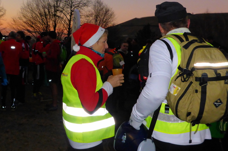Da Laura und ich Warnweste und Stirnlampe bereits bei uns tragen, begeben wir uns direkt zum Verpflegungstisch. Norbert muss sich noch warme Sachen anziehen und seine Nachtausrüstung holen. Die Sachen sind etwas unterhalb abgelegt. Rolf mahnt schnell zum Aufbruch. Ich versorge noch unsere Trinkbecher, da ist Laura bereits verschwunden. Weil ich Brigitte ebenfalls nicht mehr sehe, hoffe ich, dass unsere Tochter bei Ihr ist. Es ist schon recht dunkel und im Meer von gelben und orange farbigen Warnwesten sind die Personen schwer zu erkennen.