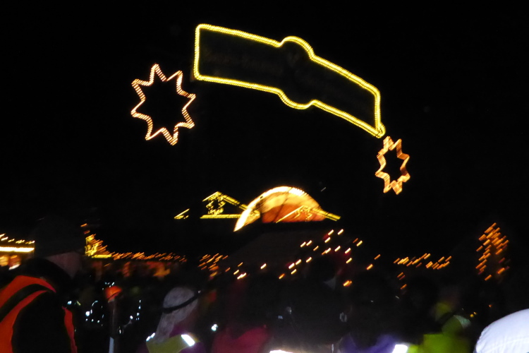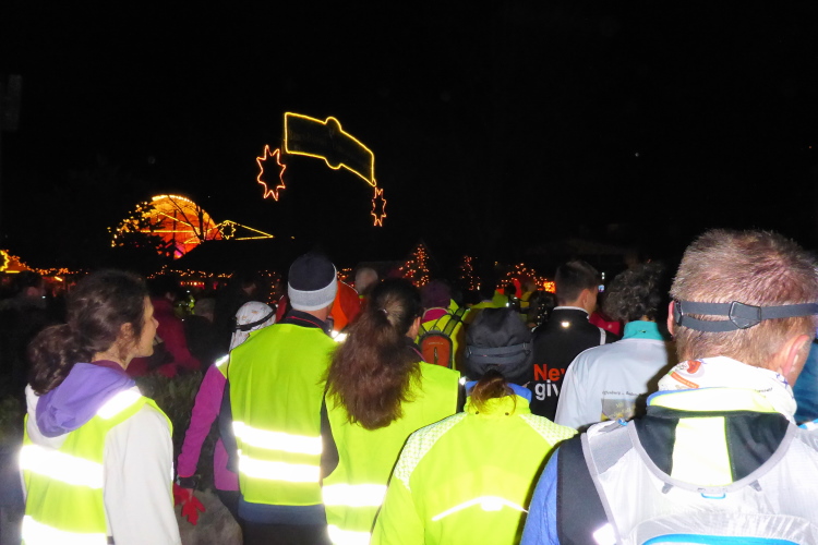 Laura fragt vorsichtig, wie weit es denn noch wäre. Dann geht es auch schon rechts steil den Berg hinunter. Eigentlich ist hier für Fahrzeuge gesperrt, aber heute fehlen die Absperrpfosten und das Polizeiauto kann weiter vor uns bleiben. Unten sind bereits die Lichter des Weihnachtsmarktes zu erkennen. Die Gruppe der Nordic Walker ist schon da und erwartet uns am Eingang des Weihnachtmarktes. Sie sind eine Stunde vor uns an der Burg Windeck gestartet. Der Polizist im Fahrzeug verabschiedet uns über Lautsprecher und wünscht uns einen schönen Zieleinlauf.