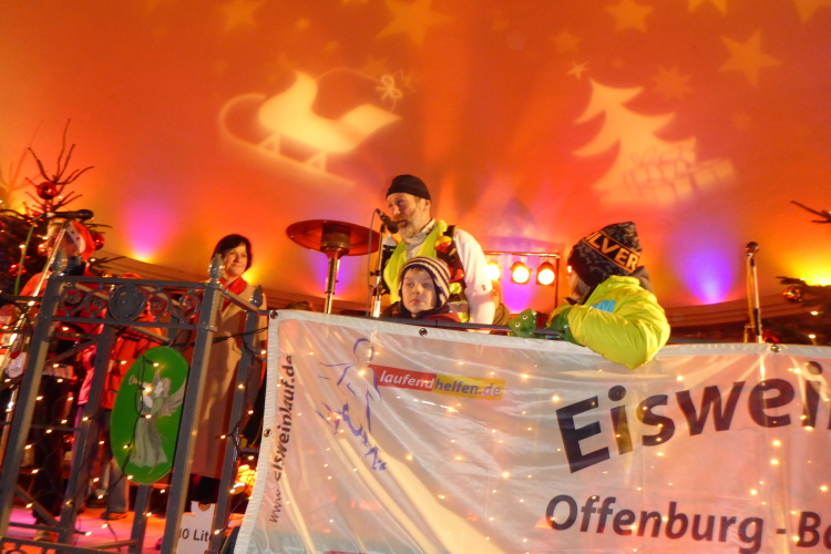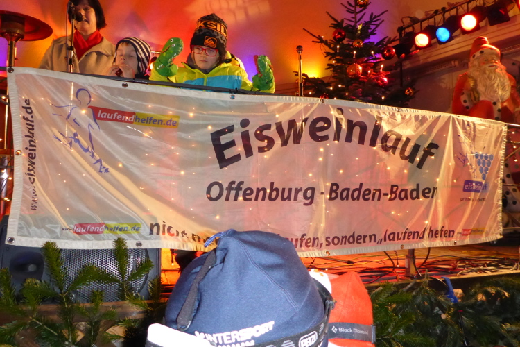 Wir haben es geschafft. Auf dem Weihnachtsmarkt ist extra eine Gasse abgesperrt. Unter dem Applaus der Zuschauer geht es Richtung Bühne. Brigitte und Rolf sind bereits oben. Während wir Läufer mit „Dambedeis“ (Hefegebäck), Punsch und Glühwein reichlich versorgt werden, kann Rolf die Spendenschecks übergeben.