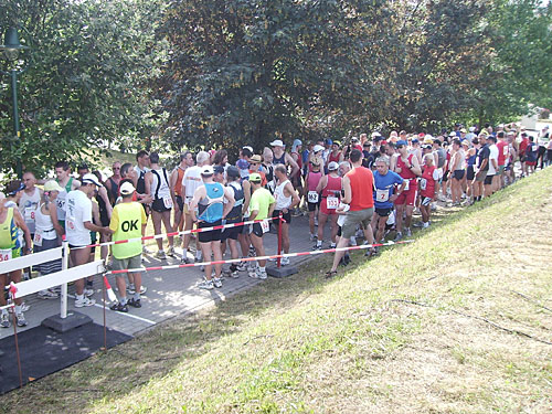 Halb Acht wache ich auf. Meine Frau kommt vom Duschen – ich hatte nicht gemerkt, dass sie schon aufgestanden war. Ich nehme auch die Waschsachen unter den Arm und dann geht’s ans Frühstück. Ich esse reichlich, nehme keine Rücksicht auf irgendwas weniger gut Verdauliches oder so. Zurück zum Zelt. Die gewohnte Prozedur vorm Lauf beginnt. Es ist genug Zeit – keine Hektik. Noch ein paar Anweisungen an meine Frau und nebenbei verfolge ich die Ansagen des Sprechers. Wer hat wie viele Male hier teilgenommen, welche Streckenrekorde gibt es etc.